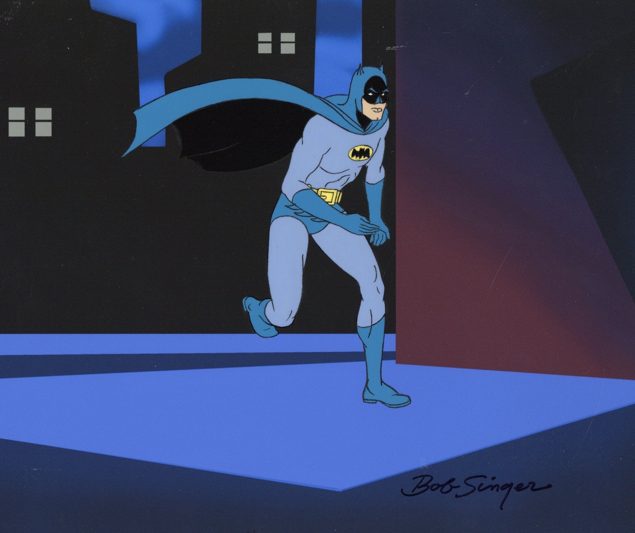 Up for sale from the series is an original production cel on printed background with matching original production drawing of Batman running. Cel comes signed by Bob Singer and set comes un framed with COA.
