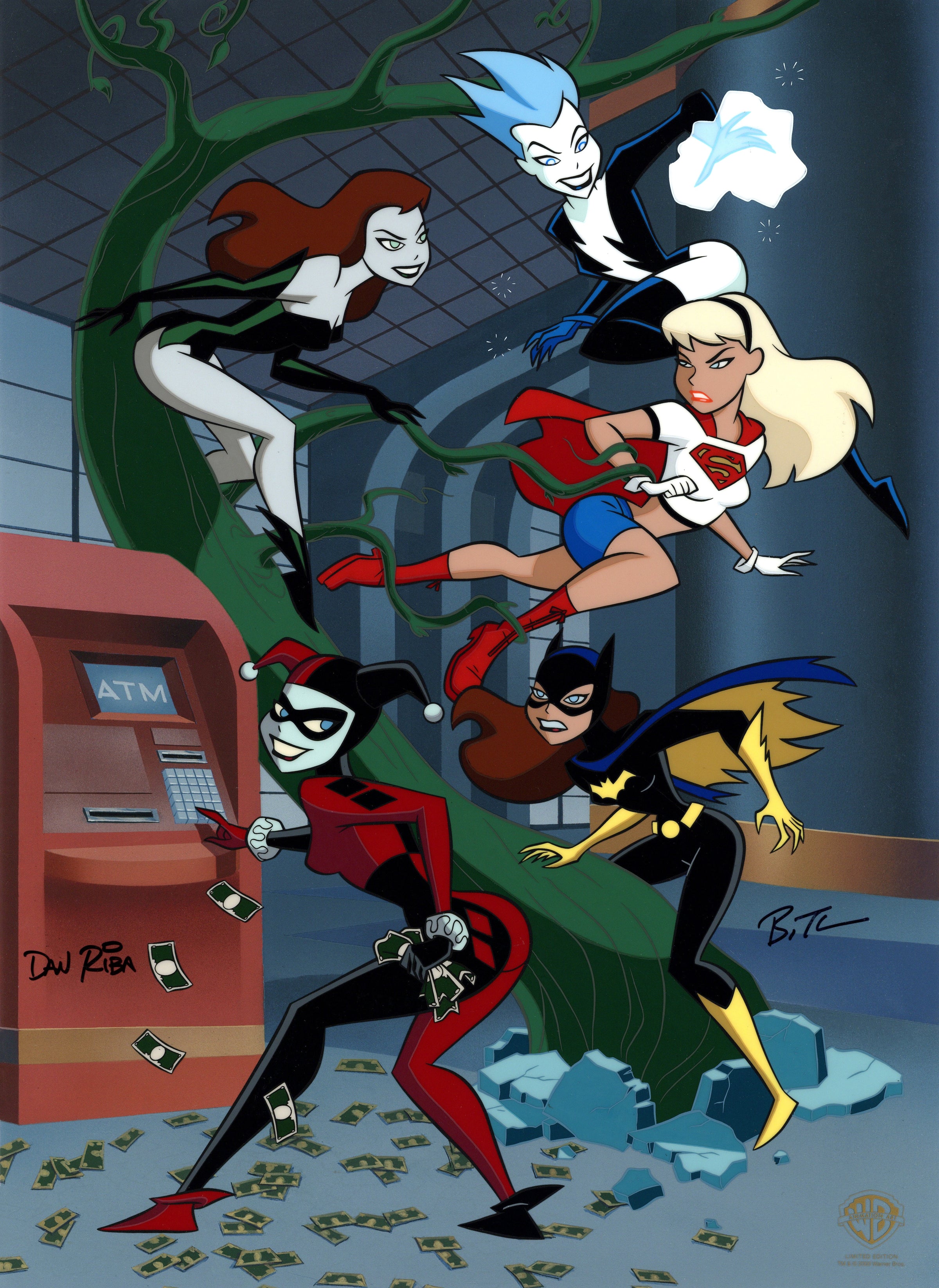 ABOUT THE IMAGE: This limited edition cel was inspired by a pivotal scene from The New Batman/Superman Adventures episode, "Girls Night Out" and features five of the heroines/villainesses for which the show is famed: Batgirl, Harley Quinn, Live Wire, Poison Ivy and Super Girl. With Batman and Superman out of town, Batgirl and Super Girl must face off against Poison Ivy and her impromptu "Girl Gang."