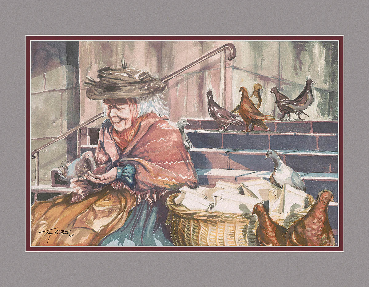 ABOUT THE IMAGE: A limited edition print inspired by Mary Poppins, designed by Disney Legend Tony Baxter. Featuring a powerful image of the Bird Woman selling bread crumbs on the steps of St. Paul's Cathedral, the artist originally designed this piece while in college in the 1960s. At the time, Baxter felt that Mary Poppins was the best film that he had ever seen, and he considered the Sherman Brothers song "Feed the Birds" to be the most poignant song in the film.