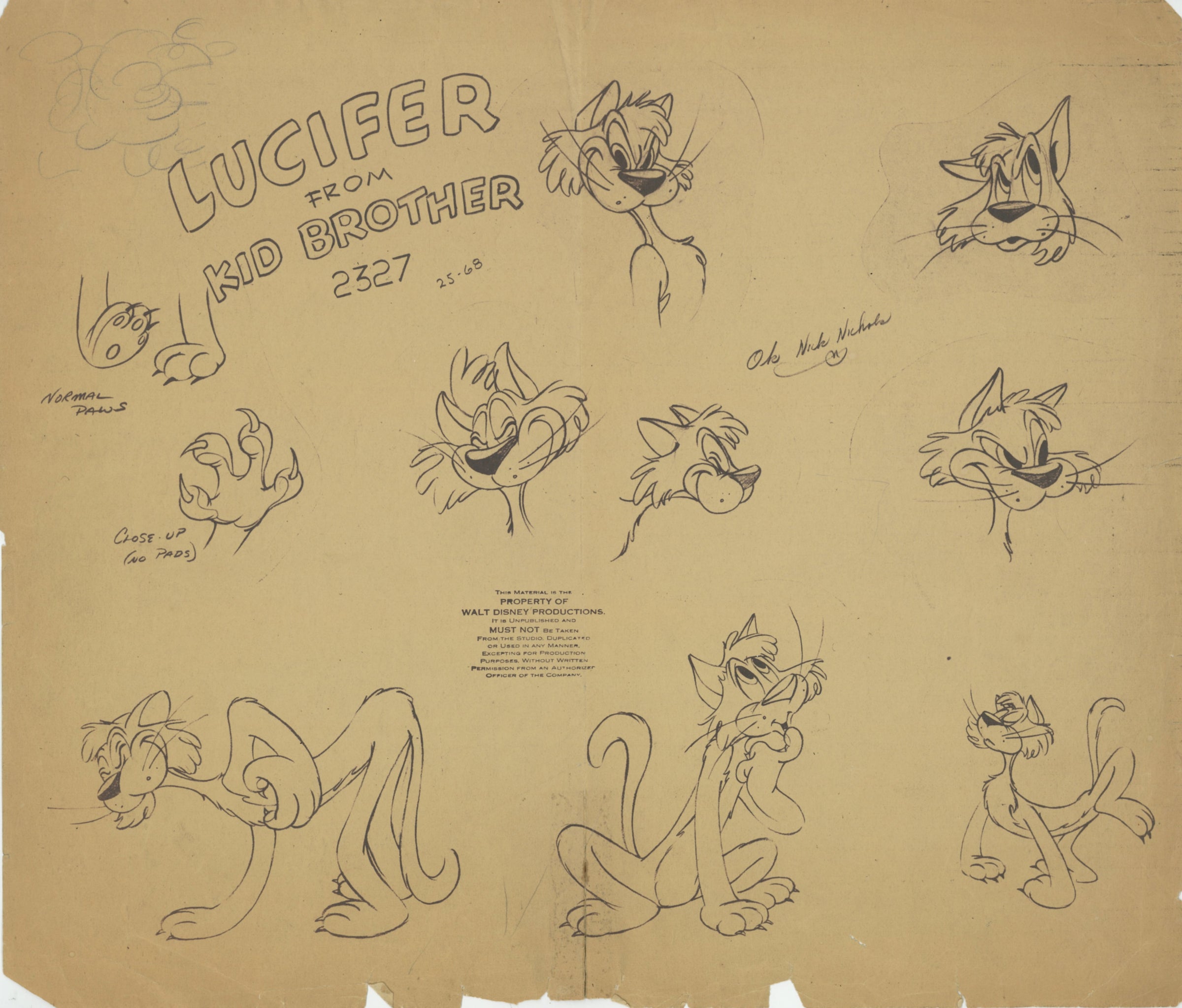 NOTES: This piece shows signs of moderate production wear: age-related toning, small tears along margins. "OK Nick Nichols" has been reproduced near the center of the model sheet.