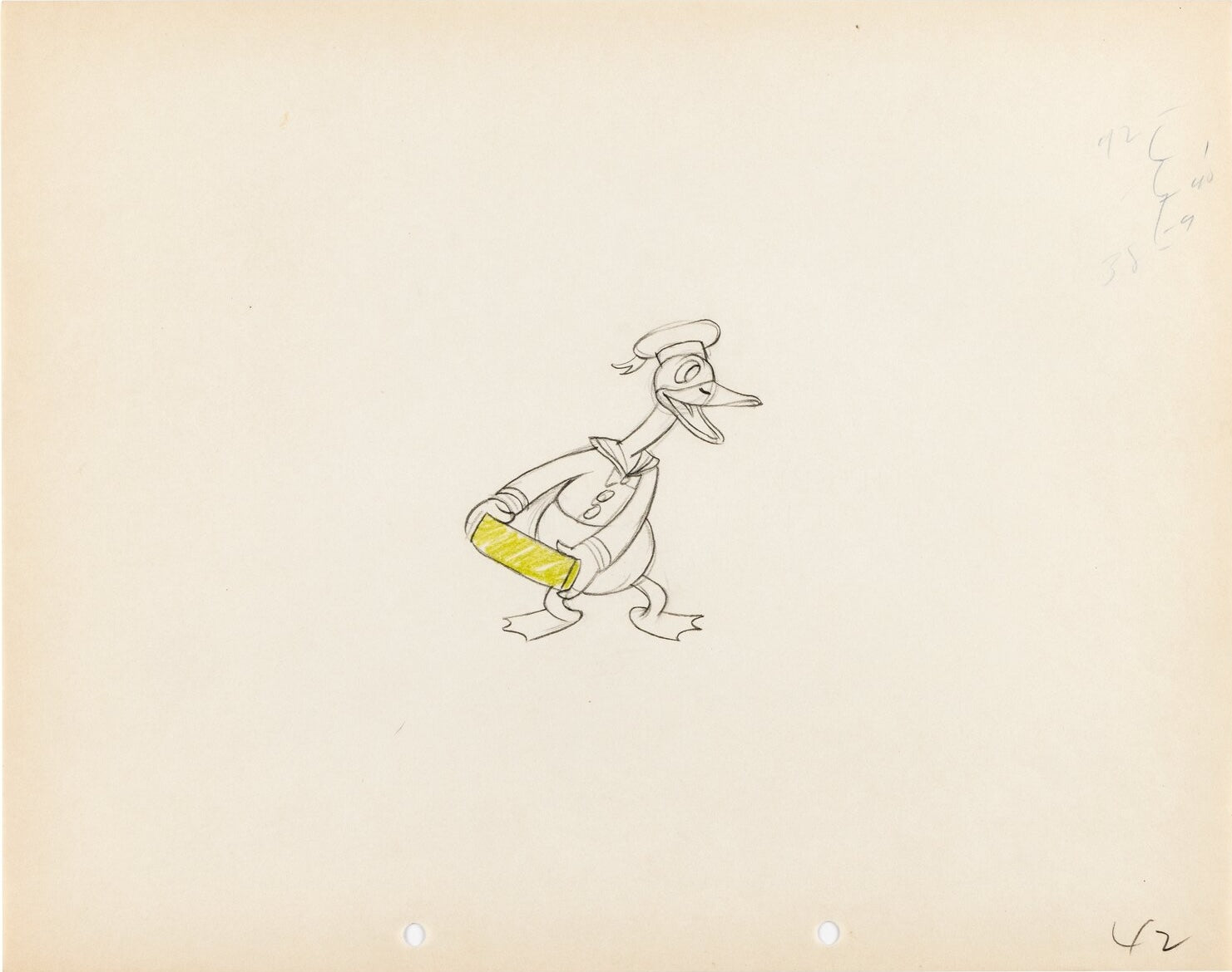 ABOUT THE IMAGE: "Little boy blue, come blow your horn." Donald Duck makes his first appearance in a Mickey Mouse short as the performer of the classic nursery rhyme "Little Boy Blue" in this historic piece! The Burt Gillett-directed short Orphan's Benefit featured four different performers trying to entertain a theater full of orphan mice with piano, operatic singing, dance, and Donald's few stubborn attempts at reciting a nursery rhyme. The 12 field 2-peghole animation drawing shines a spotlight on the classic, sought-after long-billed Donald Duck after he finally loses his patience. The mice want nothing more than to heckle him, and, after trying and failing again and again, Donald decides to take matters into his own hands. The drawing is full figure and rendered in graphite with color pencil highlights, showcasing Donald with the brick that he tosses aside at about 8:09.