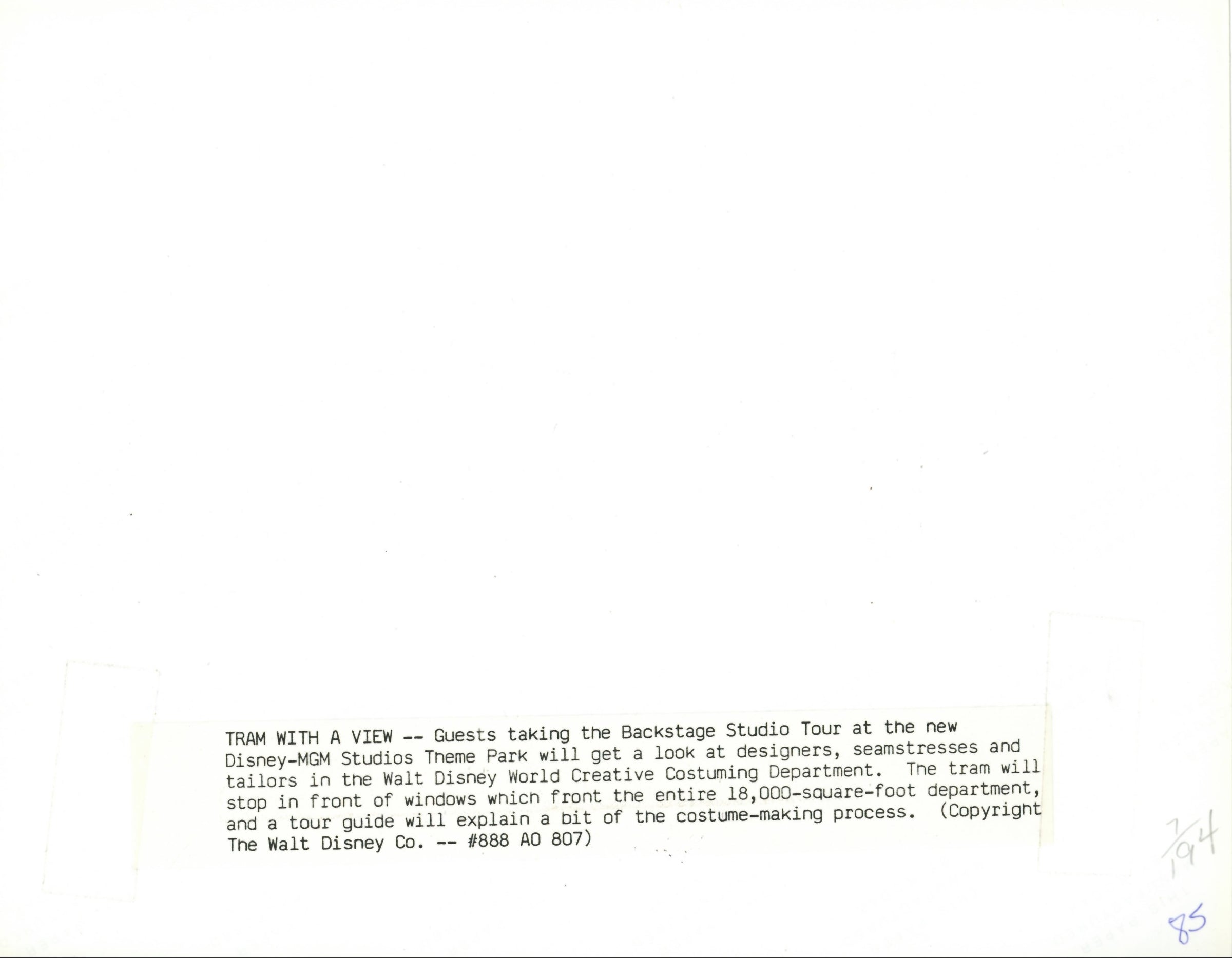 ABOUT THE IMAGE: "TRAM WITH A VIEW -- Guests taking the Backstage Studio Tour at the new Disney-MGM Studios Theme Park will get a look at designers, seamstresses and tailors in the Walt Disney World Creative Costuming Department. The tram will stop in front of windows which front the entire 18,000-square-foot department, and a tour guide will explain a bit of the costume-making process."