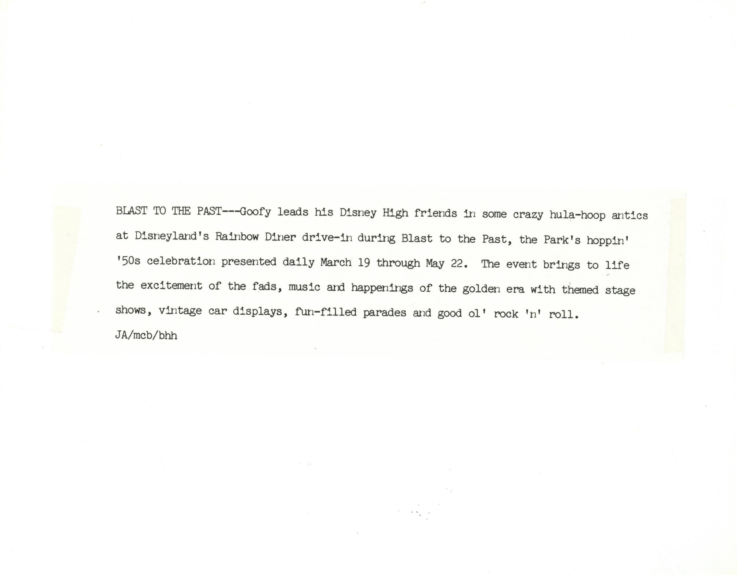 ABOUT THE IMAGE: "BLAST TO THE PAST--Goofy leads his Disney High friends In some crazy hula-hoop antics at Disneyland's Rainbow Diner drive-in during Blast to the Past, the Park's hoppin' '50s celebration presented daily March 19 through May 22. The event brings to life the excitement of the fads, music and happenings of the golden era with themed stage shows, vintage car displays, fun-filled parades and good ol' rock 'n' roll."