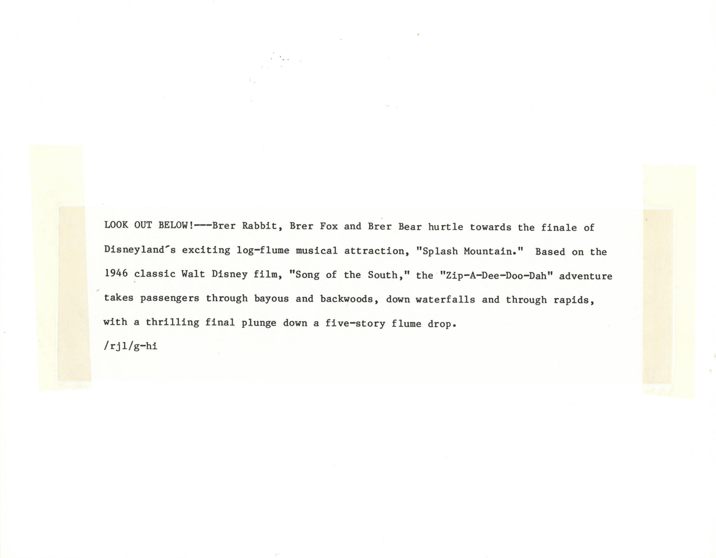 ABOUT THE IMAGE: "LOOK OUT BELOW!--Br'er Rabbit, Br'er Fox, and Br'er Bear hurtle towards the finale of Disneyland's exciting log-flume musical attraction, "Splash Mountain." Based on the 1946 classic Walt Disney film, "Song of the South," the "Zip-A-Dee-Doo-Dah" adventure takes passengers through bayous and backwoods, down waterfalls and through rapids, with a thrilling final plunge down a five-story flume drop."