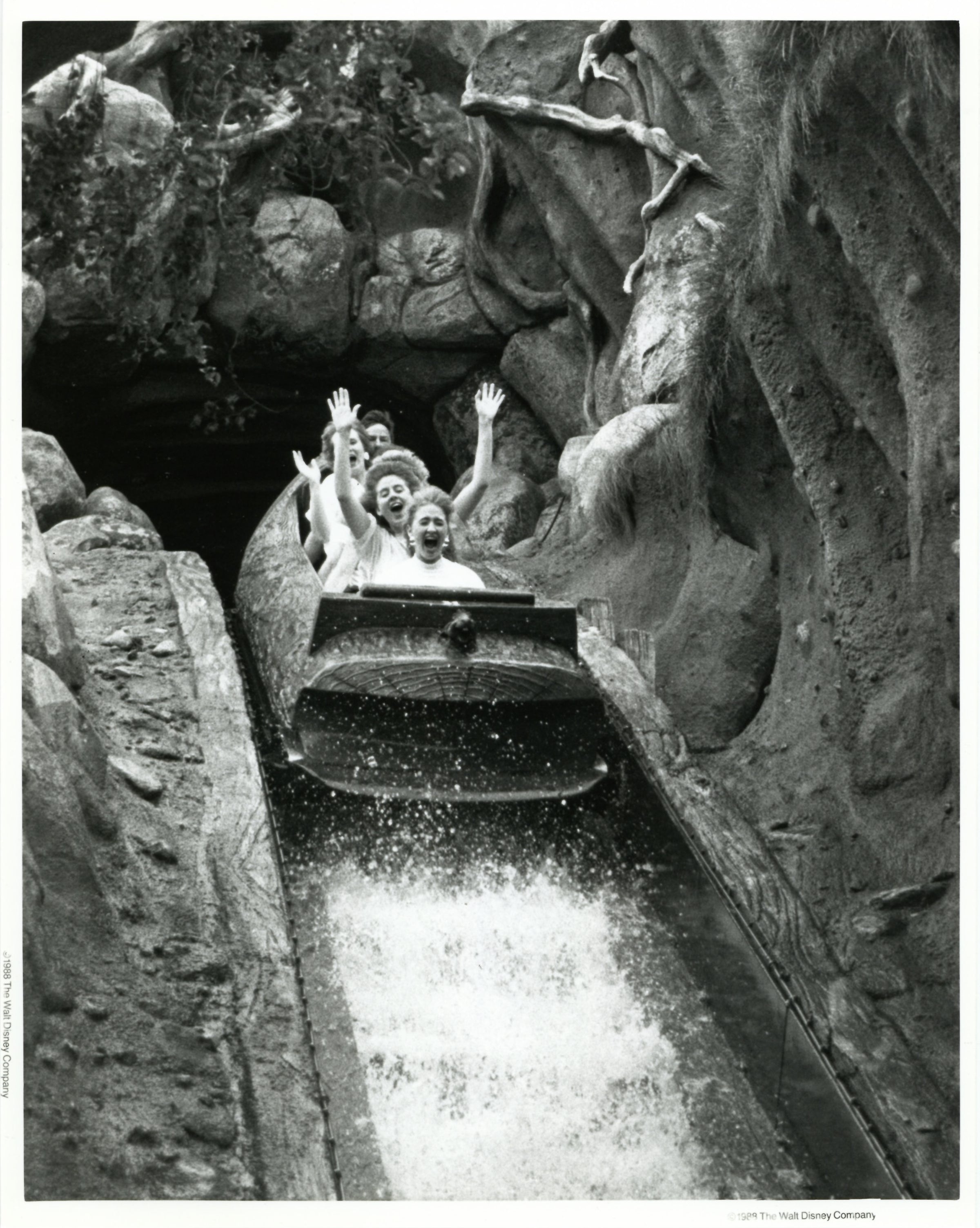 ABOUT THE IMAGE: "LOOK OUT BELOW--Disneyland guests hurtle towards the finale of Disneyland's exciting log-flume musical attraction, "Splash Mountain." Based on the 1946 classic Walt Disney film, "Song of the South," the "Zip-A-Dee-Doo-Dah" adventure takes passengers through bayous and backwoods, down waterfalls and through rapids, with a thrilling final plunge down a five-story flume drop."