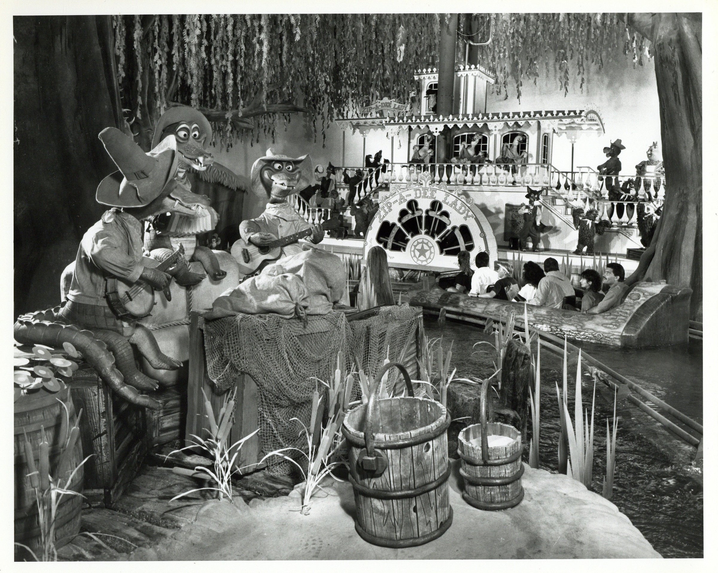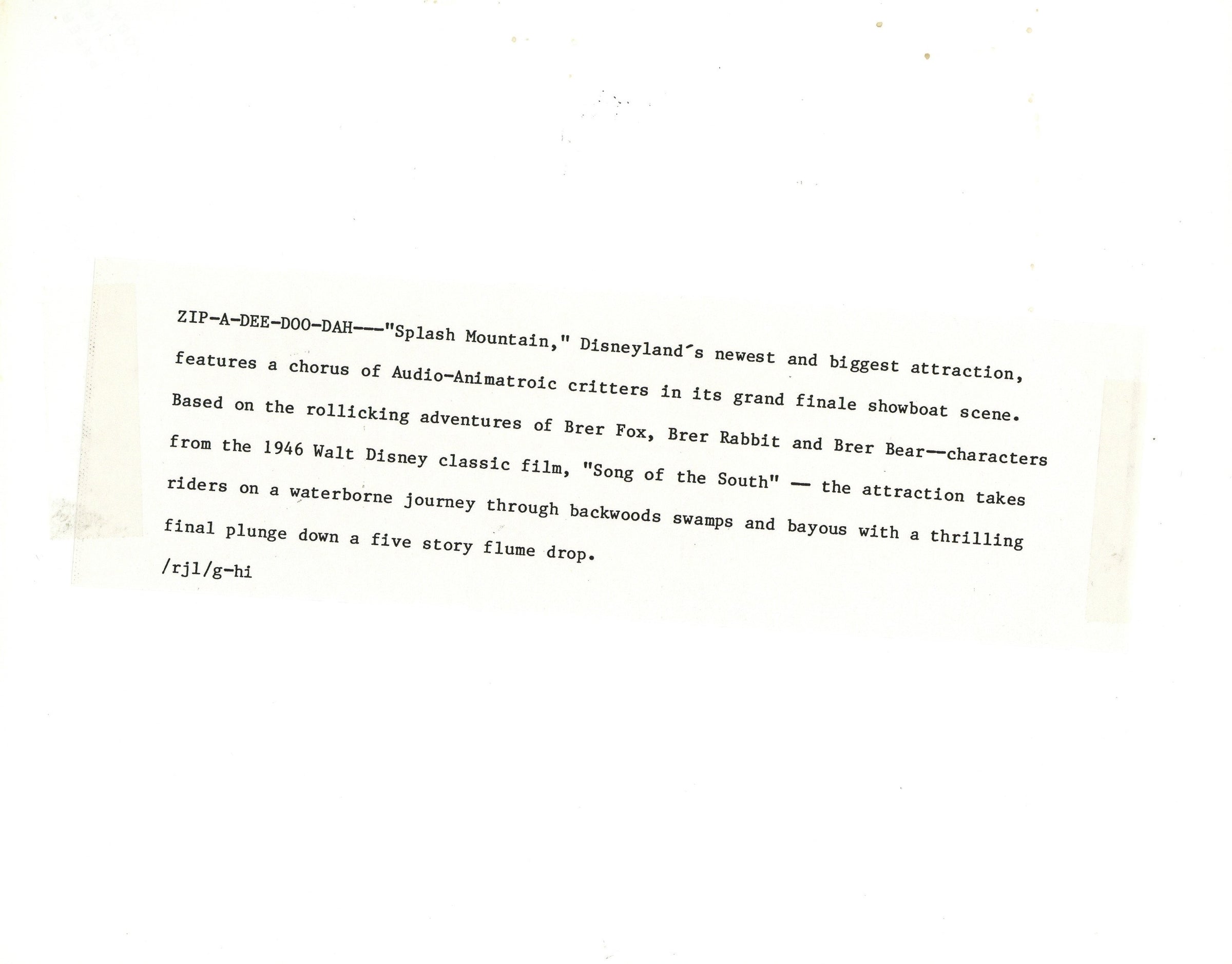 ABOUT THE IMAGE: "ZIP-A-DEE-DOO-DAH-"Splash Mountain," Disneyland's newest and biggest attraction, features a chorus of Audio-Animatroic critters in its grand finale showboat scene. Based on the rollicking adventures of Brer Fox, Brer Rabbit and Brer Bear-characters from the 1946 Walt Disney classic film, "Song of the South" — the attraction takes riders on a waterborne journey through backwoods swamps and bayous with a thrilling final plunge down a five story flume drop."