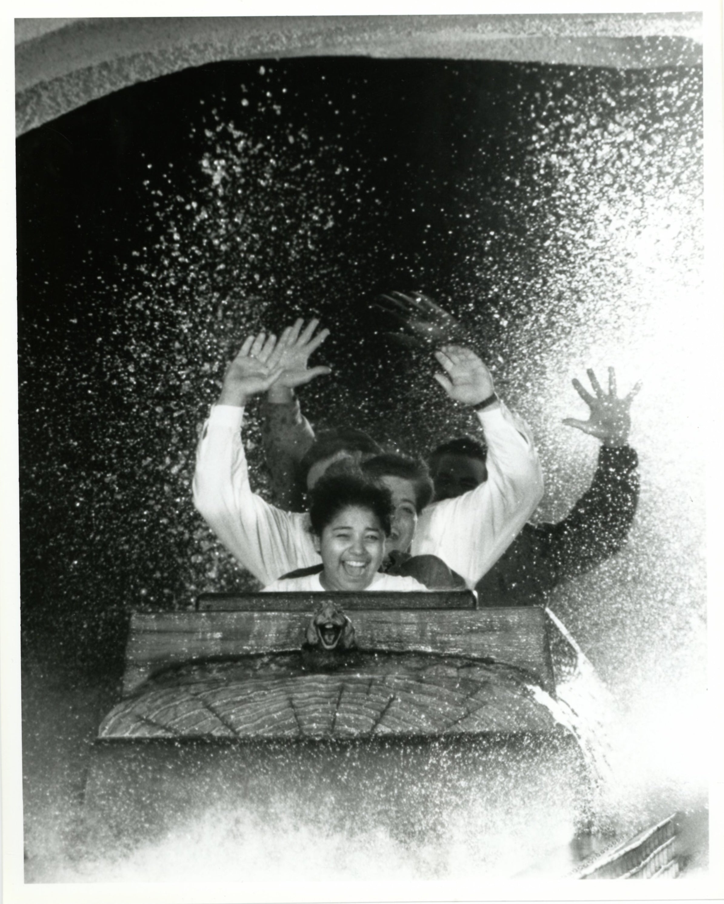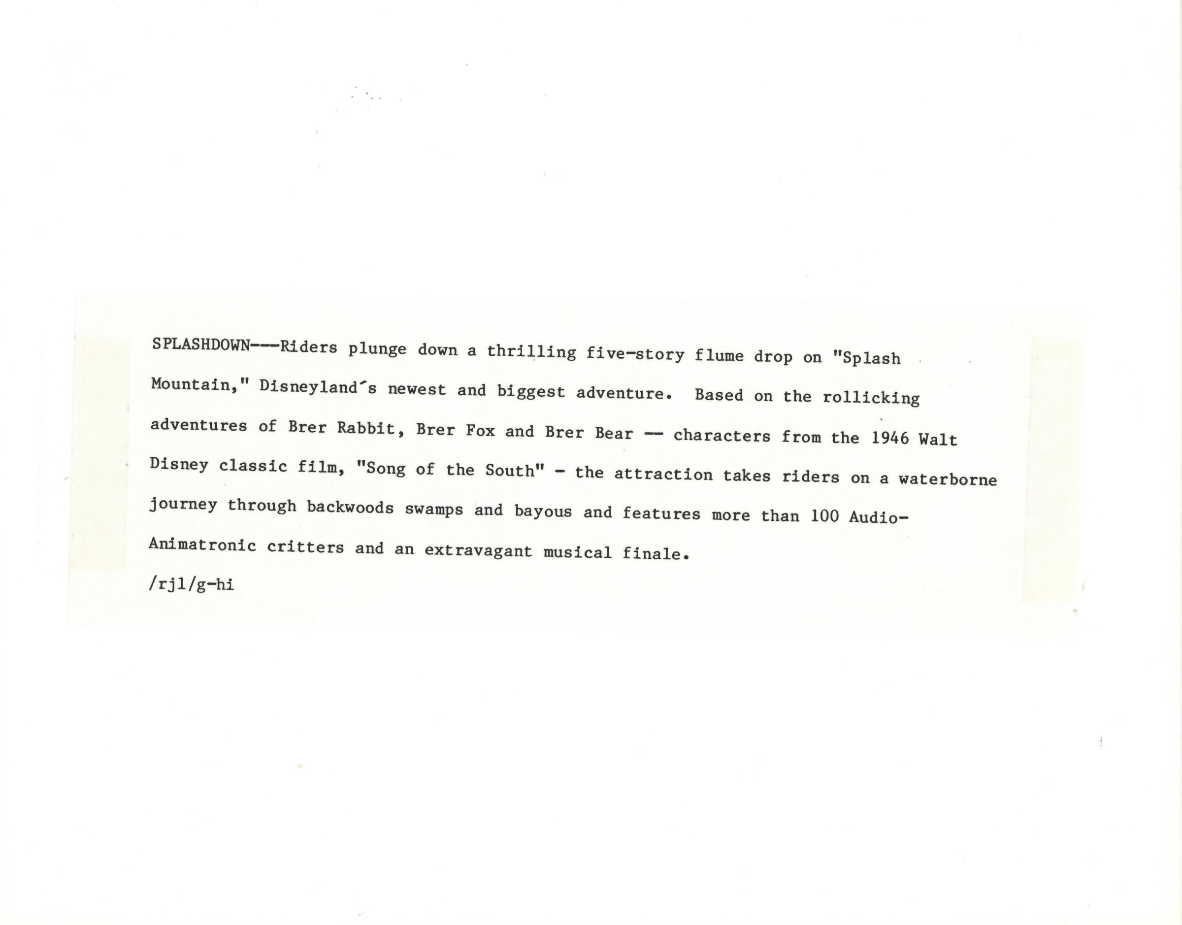 ABOUT THE IMAGE: "SPLASHDOWN--Riders plunge down a thrilling five-story flume drop on "Splash Mountain," Disneyland's newest and biggest adventure. Based on the rollicking adventures of Brer Rabbit, Brer Fox and Brer Bear — characters from the 1946 Walt Disney classic film, "Song of the South" - the attraction takes riders on a waterborne journey through backwoods swamps and bayous and features more than 100 Audio-Animatronic critters and an extravagant musical finale."