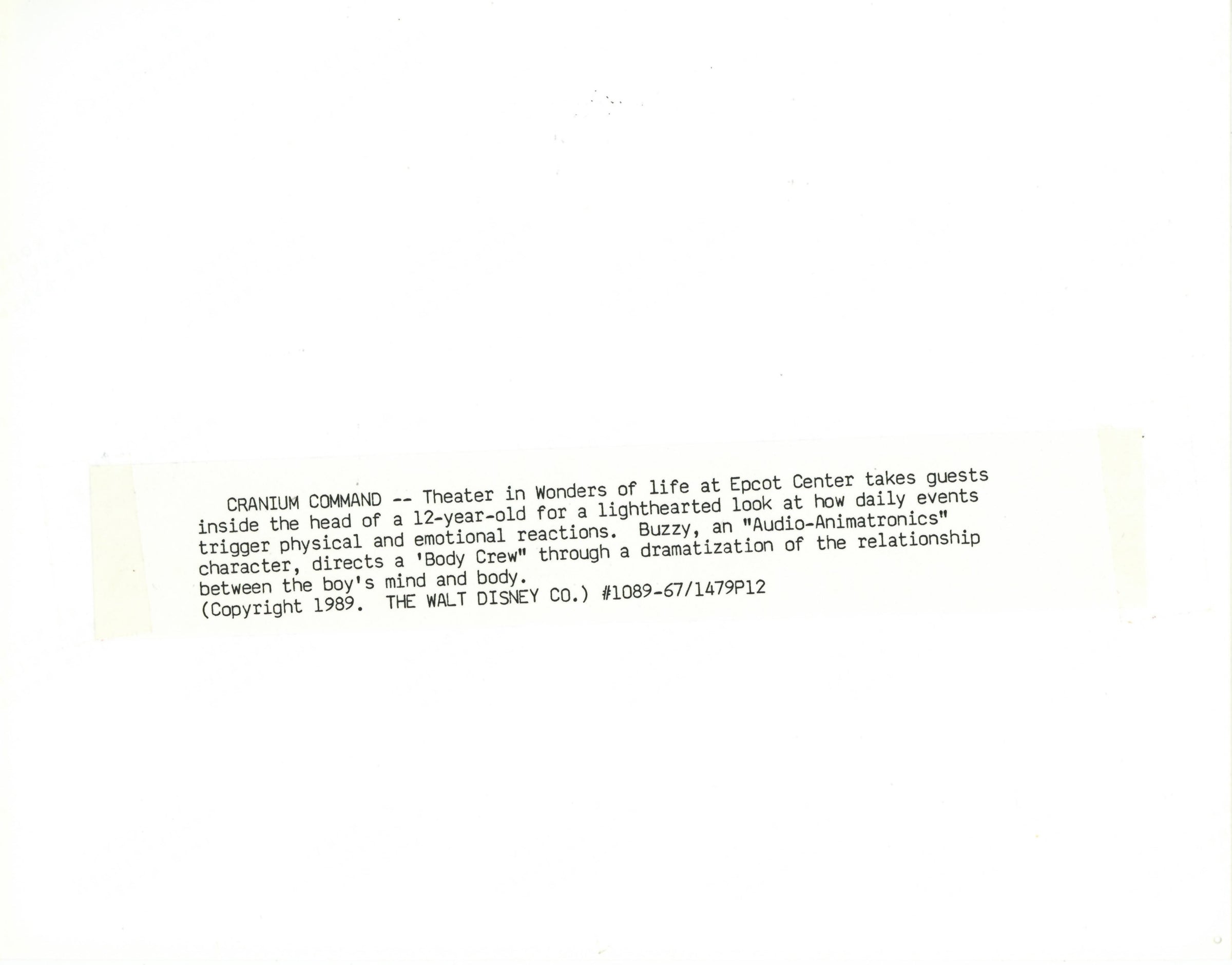 "CRANIUM COMMAND -- Theater in Wonders of life at Epcot Center takes guests inside the head of a 12-year-old for a lighthearted look at how daily events trigger physical and emotional reactions. Buzzy, an "Audio-Animatronics" character, directs a 'Body Crew' through a dramatization of the relationship between the boy's body and mind."