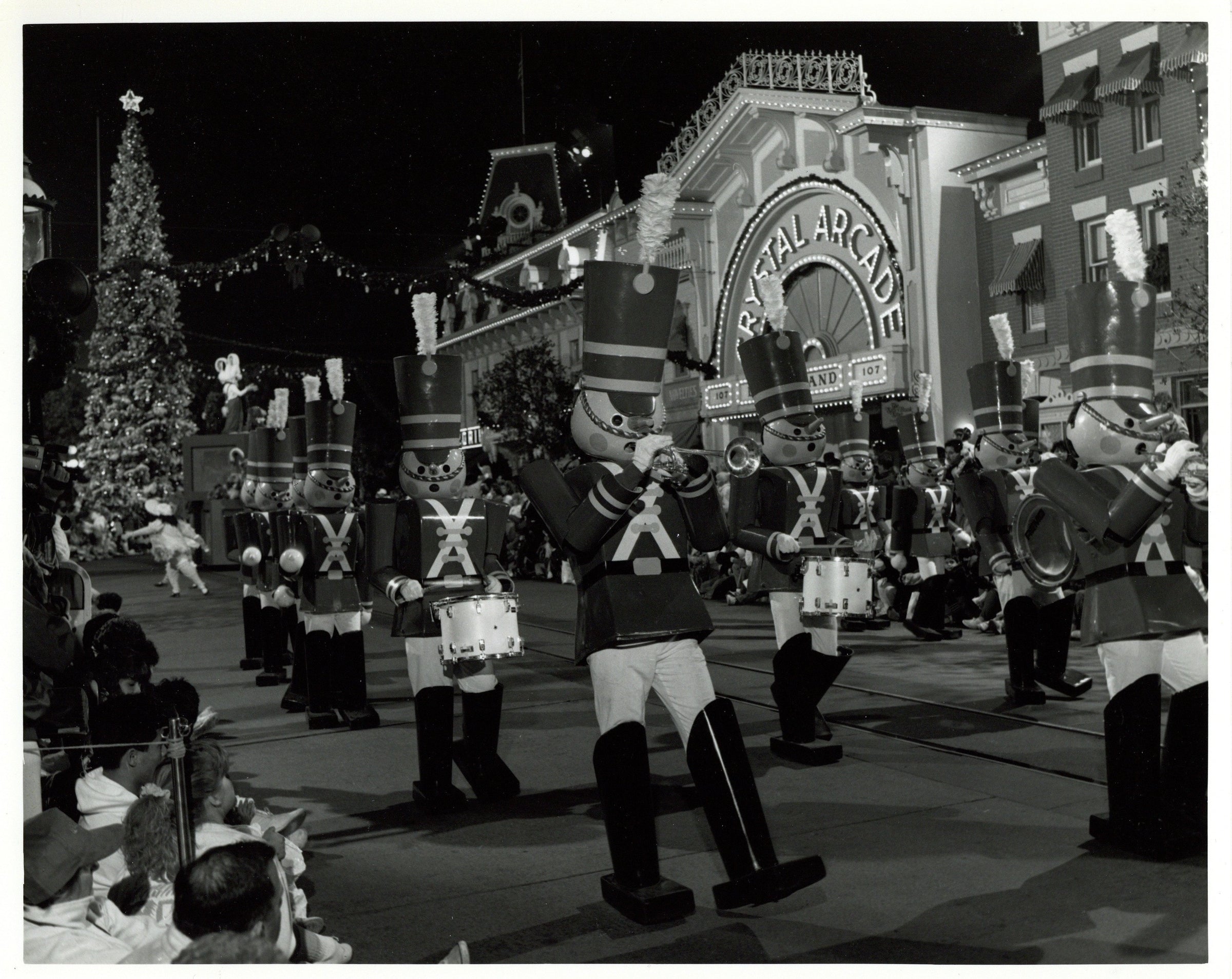 ABOUT THE IMAGE: "MARCHING IN THE HOLIDAY SEASON -- Disneyland's army of toy soldiers begins marching its way down Main Street, U.S.A. on Nov. 22 (Thanksgiving Day) as part of the daily performance of the "Very Merry Christmas" Parade. The 60-foot-tall white fir tree in Town Square will be adorned with thousands of colorful ornaments and lights, and strolling Dickens carolers and traditional holiday music will add to the yuletide ambiance. Disneyland continues to celebrate its 35th Anniversary with the Dream Machine, which gives away a brand new GEO automobile every day."