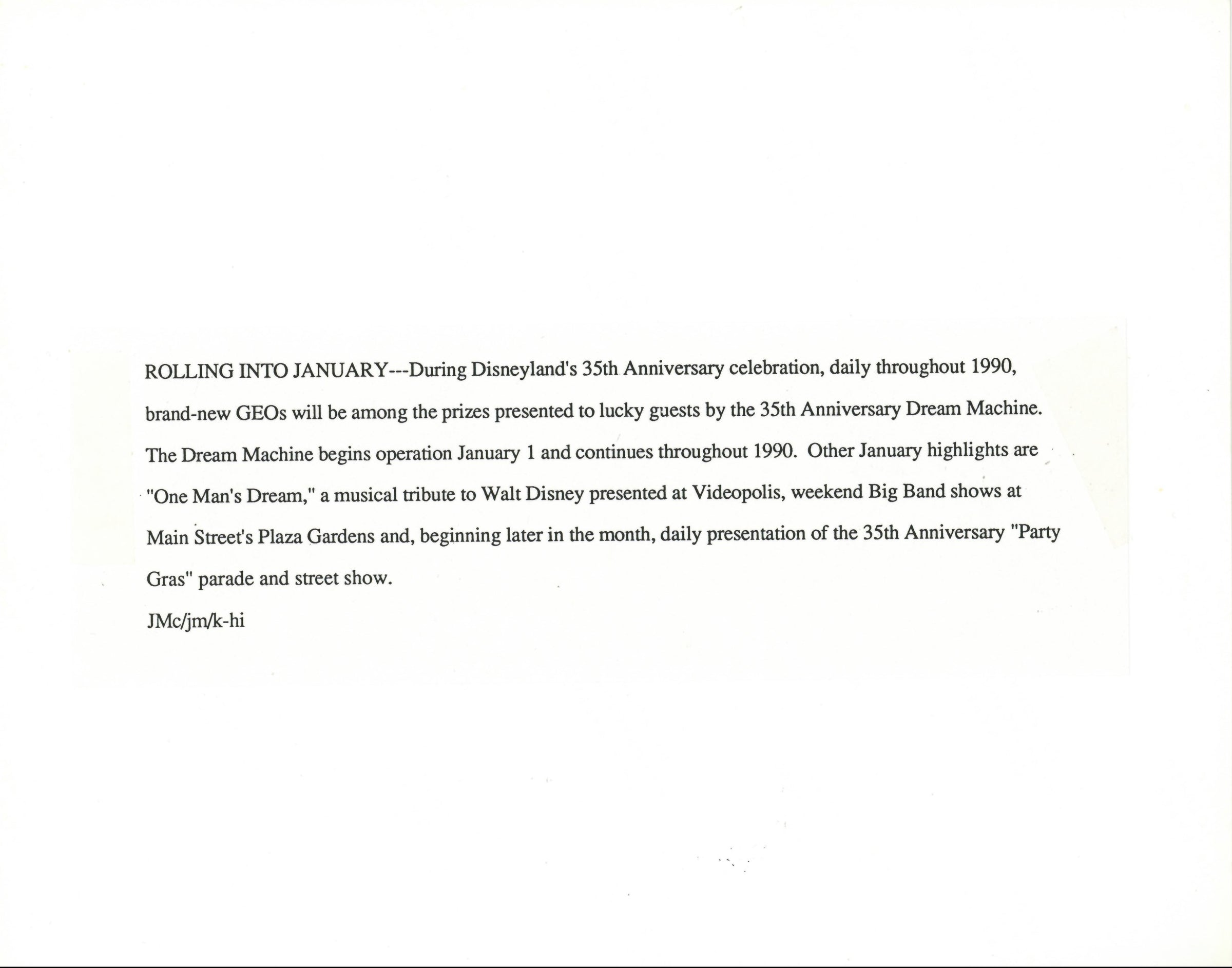 ABOUT THE IMAGE: "ROLLING INTO JANUARY --During Disneyland's 35th Anniversary celebration, daily throughout 1990, brand-new GEOs will be among the prizes presented to lucky guests by the 35th Anniversary Dream Machine. The Dream Machine begins operation January 1 and continues throughout 1990. Other January highlights are "One Man's Dream," a musical tribute to Walt Disney presented at Videopolis, weekend Big Band shows at Main Street's Plaza Gardens and, beginning later in the month, daily presentation of the 35th Anniversary "Party Gras" parade and street show."
