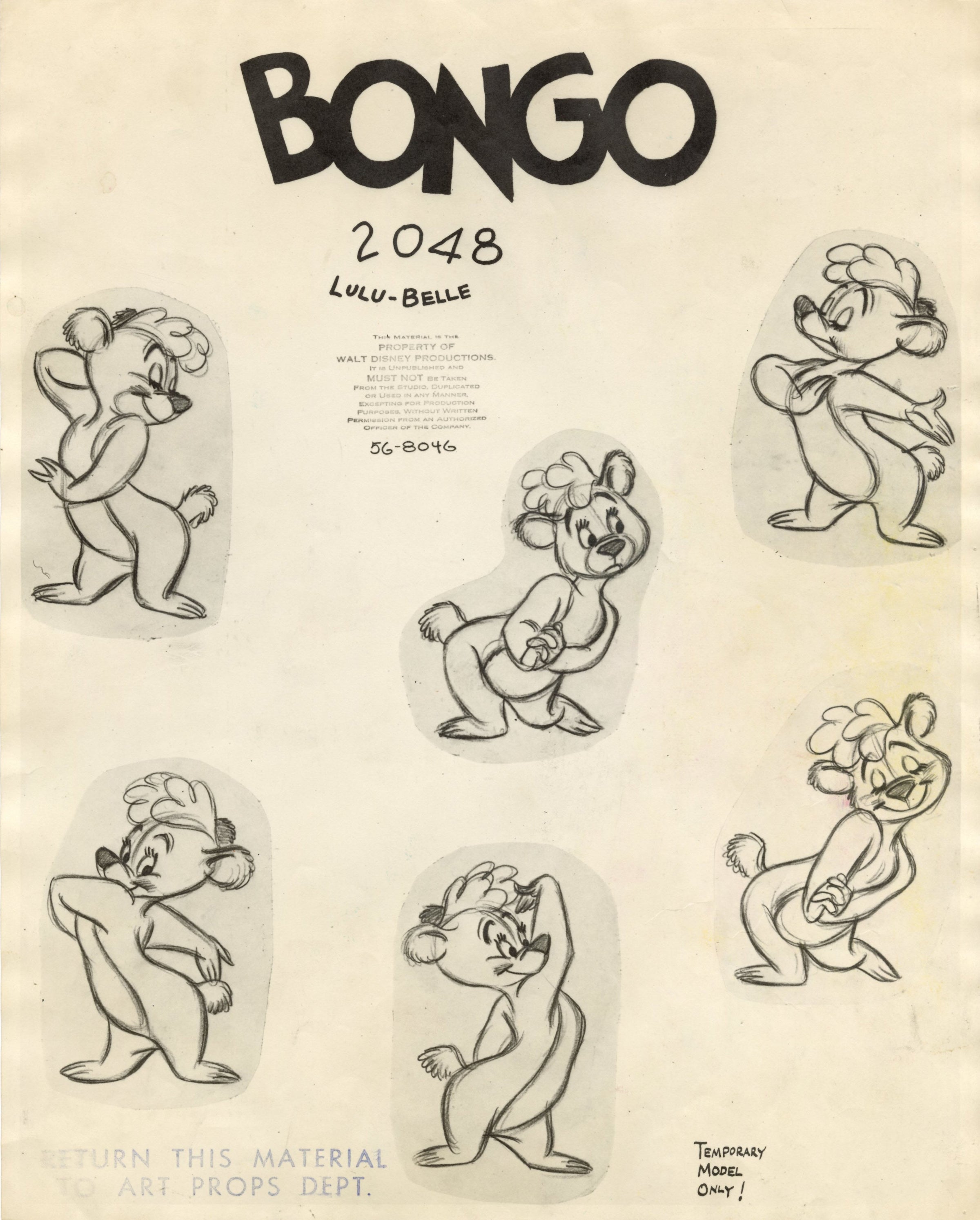 ABOUT THE MEDIUM: Photostat Model Sheets are reference guides used by animators to ensure consistency in character design, proportions, and expressions throughout a film. These printed sheets typically feature multiple poses, facial expressions, and turnarounds of a character, often photocopied from finalized drawings by lead animators. Model sheets help maintain uniformity in animation by providing a standard reference for all artists working on a character, preventing visual discrepancies between different scenes.