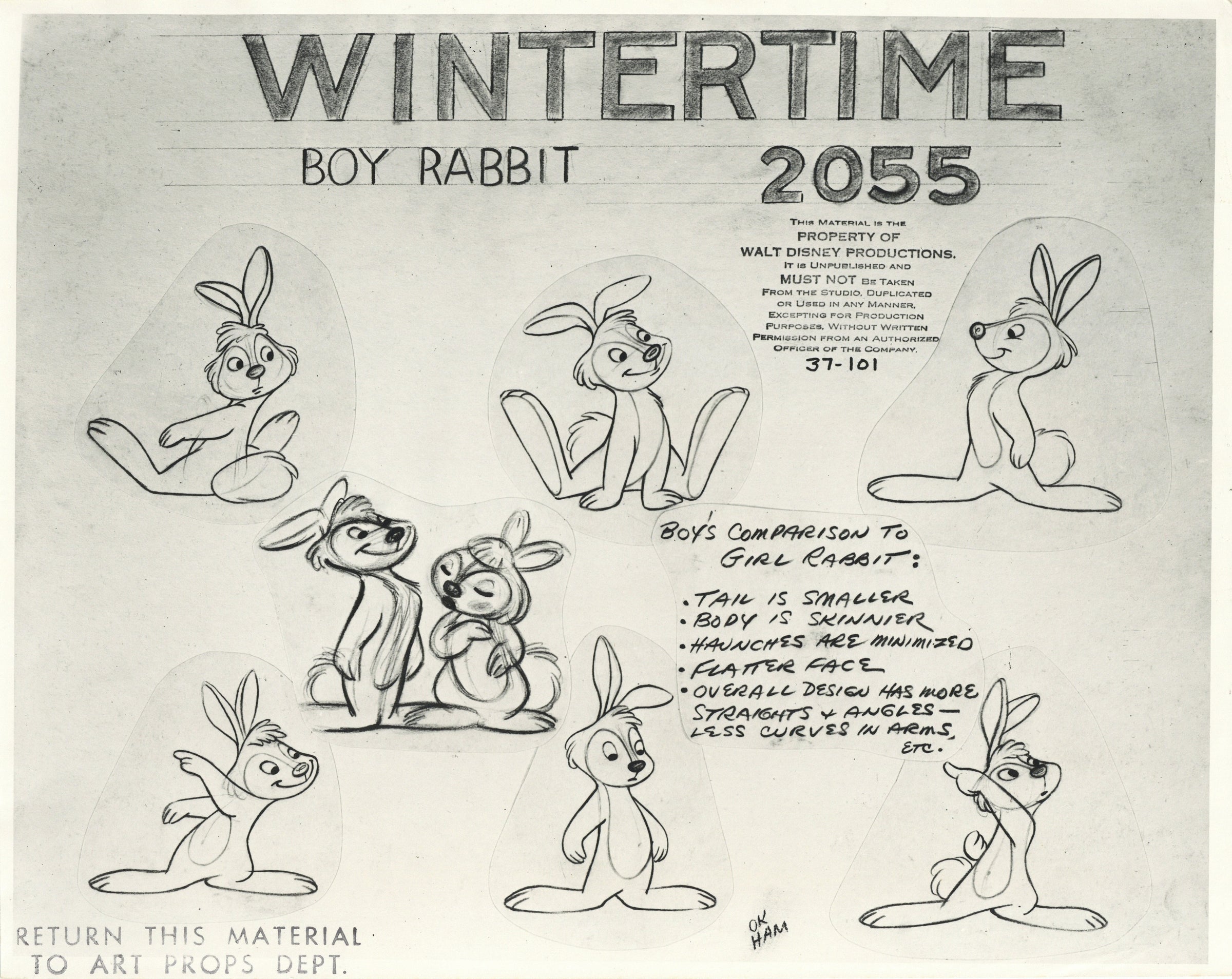 ABOUT THE MEDIUM: Photostat Model Sheets are reference guides used by animators to ensure consistency in character design, proportions, and expressions throughout a film. These printed sheets typically feature multiple poses, facial expressions, and turnarounds of a character, often photocopied from finalized drawings by lead animators. Model sheets help maintain uniformity in animation by providing a standard reference for all artists working on a character, preventing visual discrepancies between different scenes.