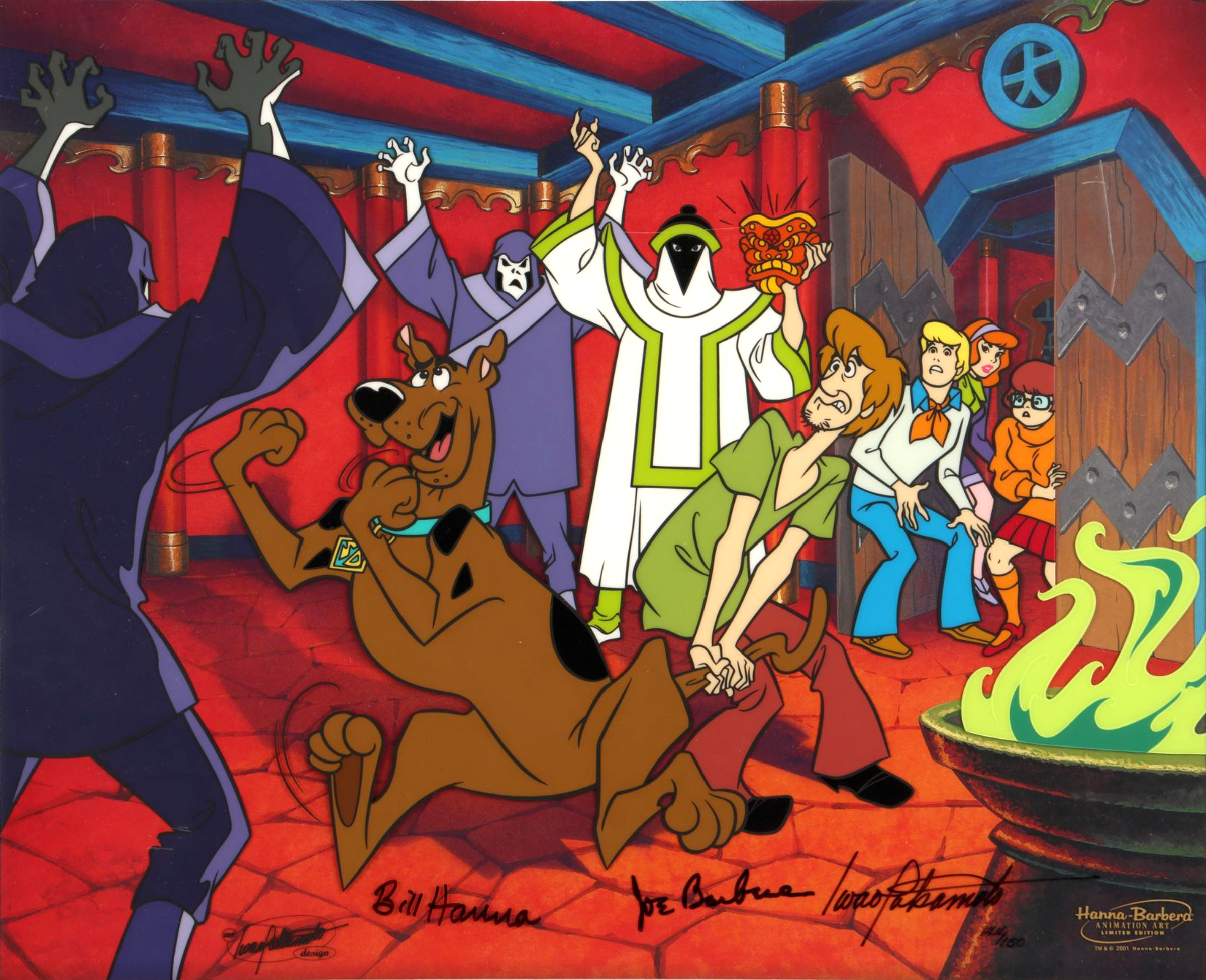 ABOUT THE IMAGE: A bold and vibrant hand-painted limited edition cel featuring Scooby and The Gang facing off against masked monsters in a classic haunted house setting. The piece is titled "Mystery Mask Mix-Up!" and has been signed by creators Bill Hanna, Joe Barbera and the artist Iwao Takamoto.