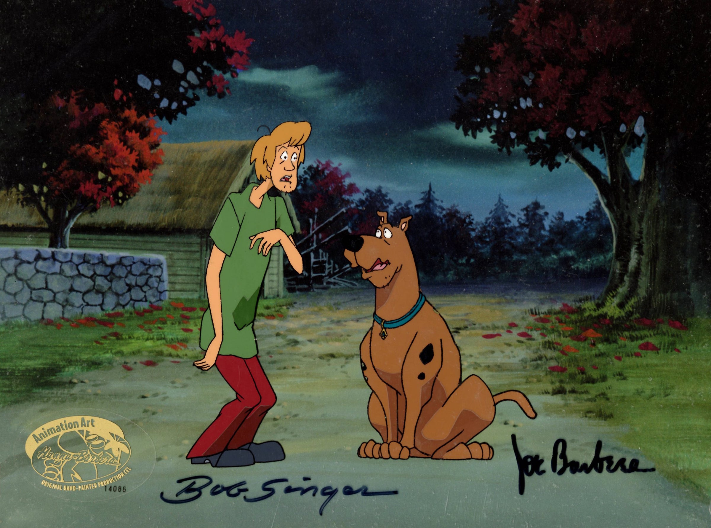 ABOUT THE IMAGE: The Hanna-Barbera cartoon, Scooby-Doo, Where Are You? was launched in 1969 and has had the longest run of a cartoon series. Over the years it’s been in 19 TV series (on CBS, ABC, the WB, Cartoon Network and Boomerang) and more than 40 animated films and two live action movies; one grossed $275 million worldwide. The show featured brainiac Velma, jock Fred, fashionista Daphne, hippie Shaggy, and the talking Great Dane Scooby-Doo, who would pile into their Mystery Machine van and hit the road searching for weird phenomena to solve. This original production cel is hand-signed by key animator Bob Singer and comes with a certificate of authenticity.