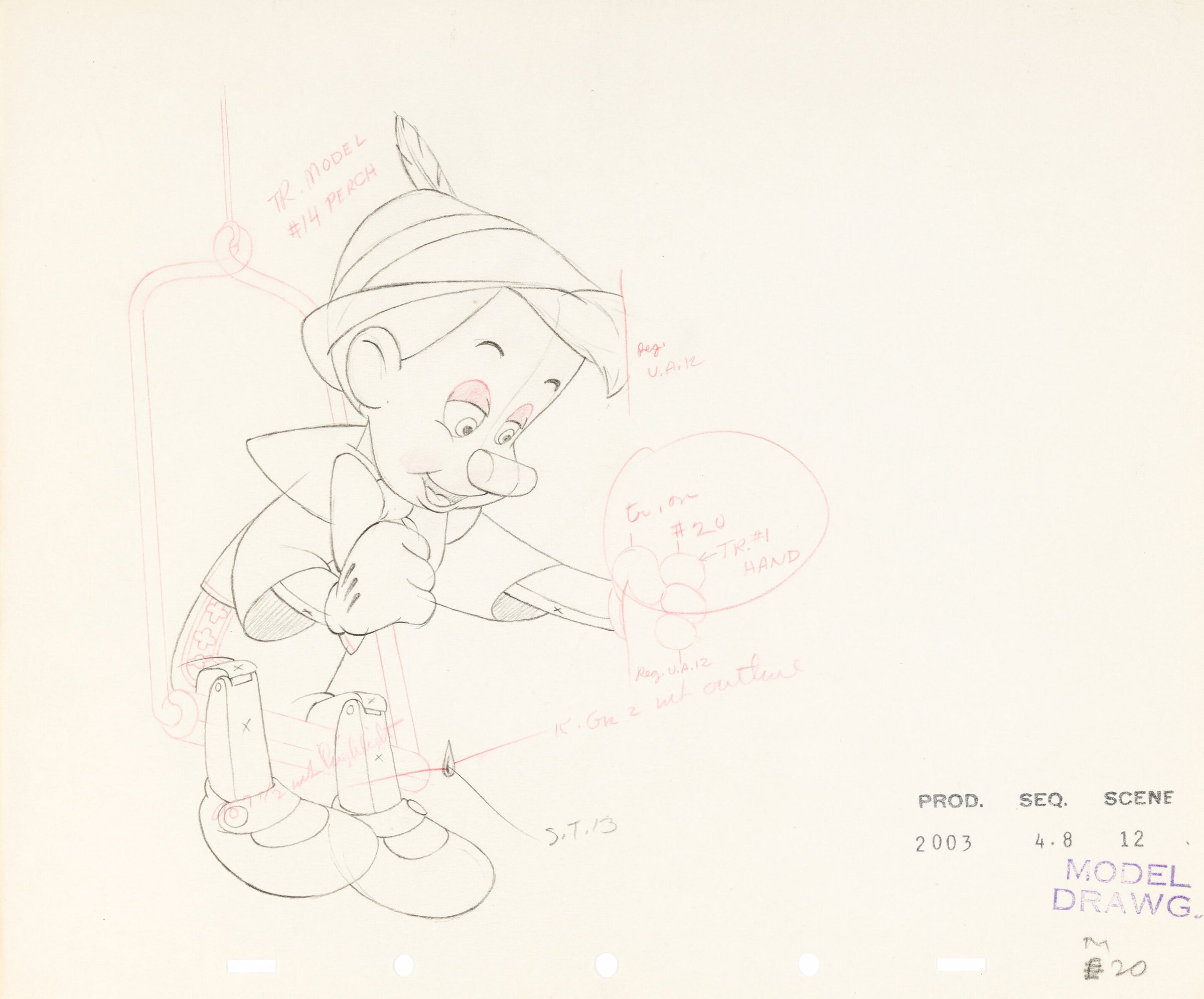 ABOUT THE IMAGE: "Jiminy! Gee, I'm glad to see you!" While trapped in a birdcage by the greedy Stromboli, Pinocchio is relieved to see Jiminy Cricket in this fantastic original color model drawing from Walt Disney's animated masterpiece Pinocchio. Created for the moment seen at the 45:08 mark of the film, this drawing is rendered in graphite and color pencil with extensive hand-written color notes. Pinocchio measures a large 7" x 8" on the 12 field 5-peghole animation paper. The drawing bears a studio stamp in the lower right corner with the production, sequence, and scene numbers 2003, 4.8, and 12.