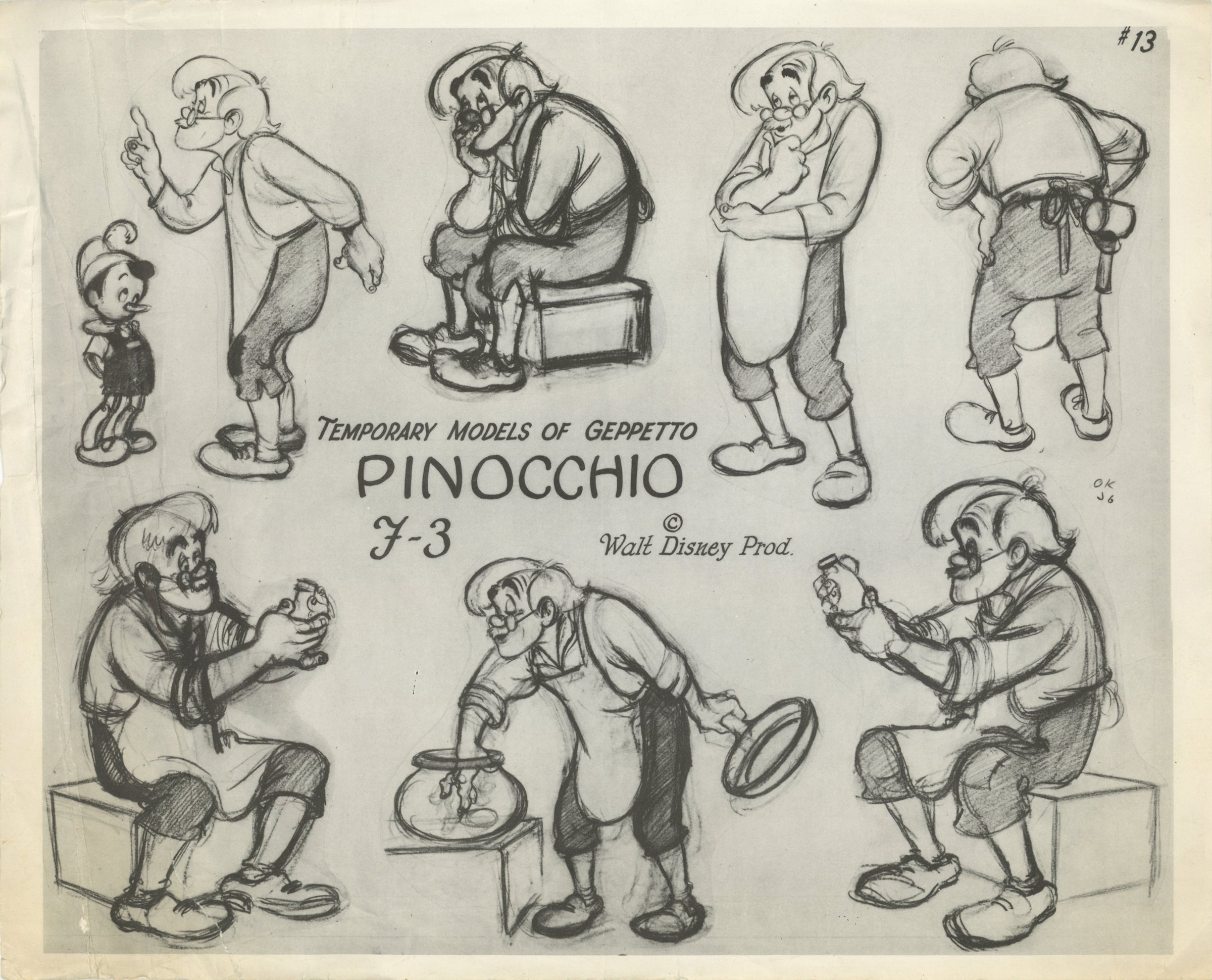 ABOUT THE IMAGE: Geppetto is featured here in this spectacular studio-printed character model sheet used during the production of Walt Disney's 1940 animated feature masterpiece Pinocchio. The character appears in many different angles in several expressions and poses. Including some repeats, this image was printed on photographic paper by the Walt Disney studio in extremely limited quantities, and it is considered especially rare.
