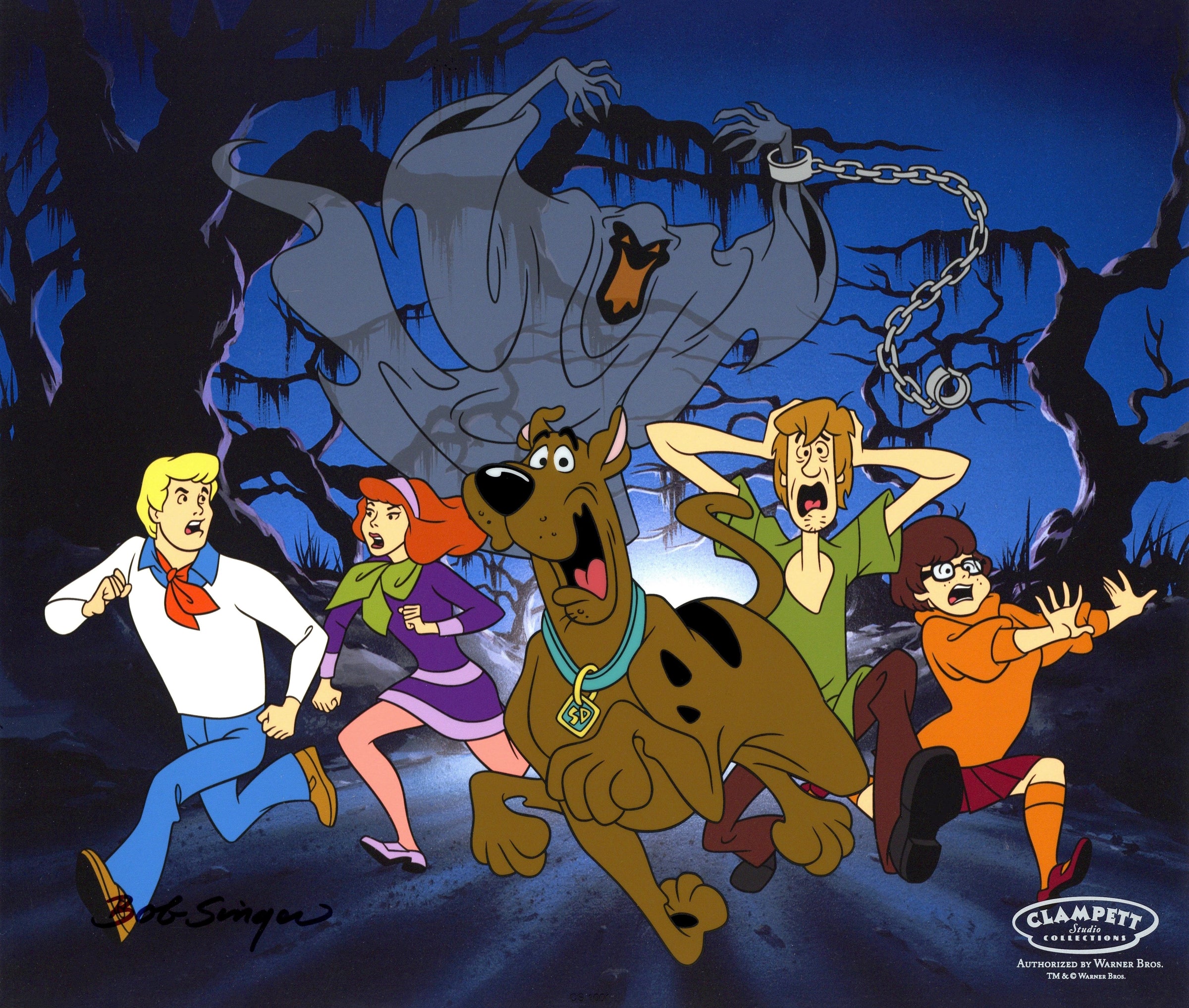 ABOUT THE IMAGE: Taken from the hit renown 1970 episode, “A Night of Fright is No Delight,” Relp! It’s The Green Ghost is illustrated by famed Warner Bros. artist, Vince Musacchia, and painted by Warner Bros. director, Dennis Durrell, shows the Mystery Gang dashing from one of their more infamous adversaries, The Green Ghost.
