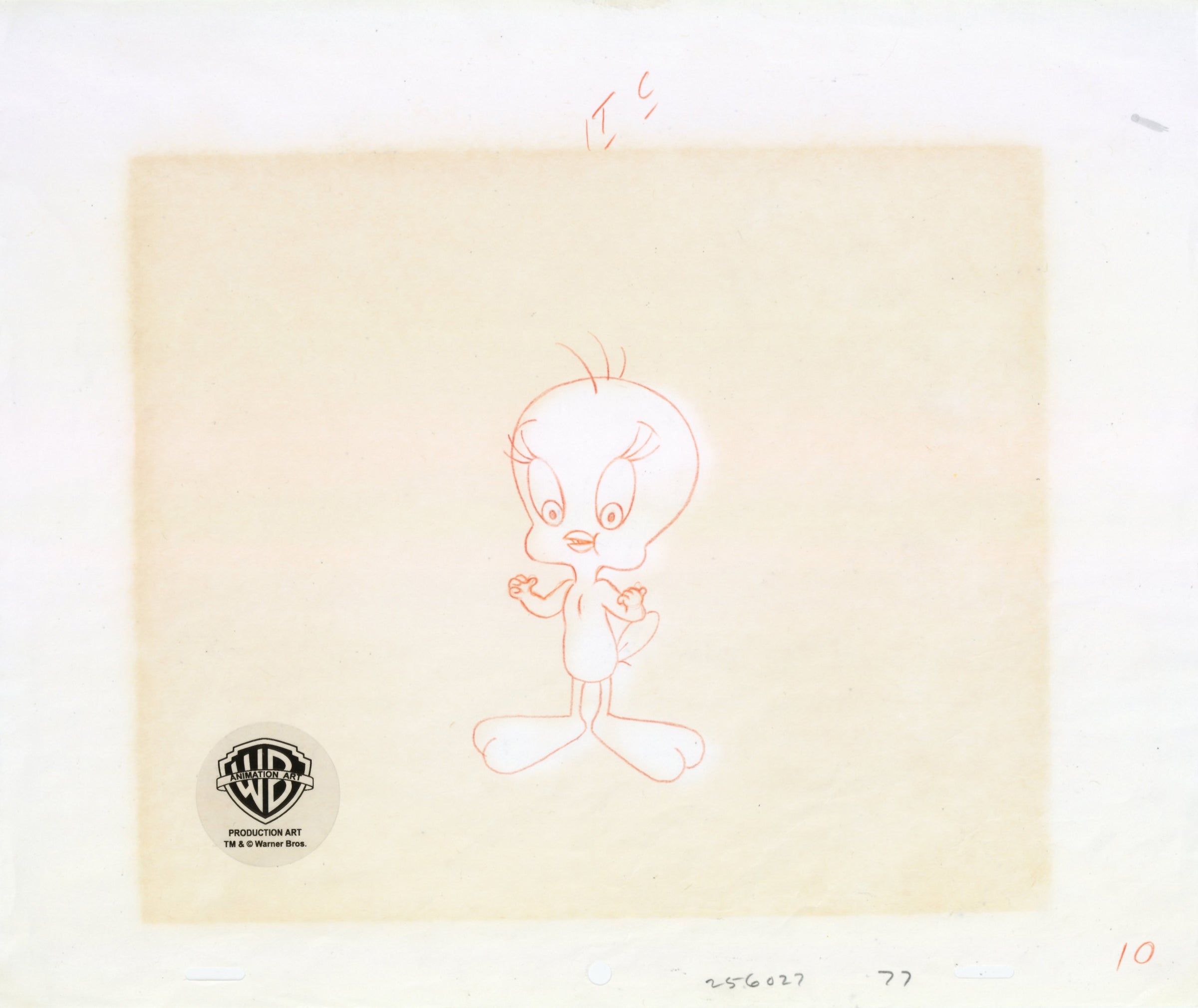 ABOUT THE IMAGE: This is an original production drawing of Tweety Bird crafted in the making of a public service announcement animation. Warner Brothers and Mel Blanc's company, Blanc Communications, made a 22-minute live-action/animation public service film for the Shriners Burn Institute. (It should be noted that Mel Blanc was a long-time Shriner.) The animated portion of the film featured Bugs Bunny, Daffy Duck, Sylvester and Tweety Bird. The animated segments were shown as PSA spots on the Saturday morning "Bugs Bunny and Road Runner Show" on ABC. The full-figure image of Tweety measures 2.5" x 4.5", rendered in red colored pencil on animation paper. A fantastic piece of production artwork of the beloved bird from the Looney Tunes pantheon!