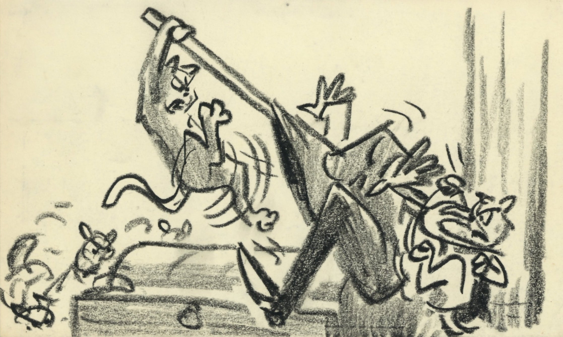 ABOUT THE IMAGE: This storyboard showcases the creativity involved in the making of The Aristocats. It was created for climactic sequence starting at about 1:12:52 when Edgar locks Duchess and her kittens in a trunk, ready to ship them off for good. O'Malley, Roquefort, Frau, and even Scat Cat and the Alley Cats help to stop him and make sure he's the one who is sent to Timbuktu. The artist of this storyboards is thought to be Vance Gerry (1929 - 2005), a storyboard, layout, and character artist at Disney for nearly 50 years.