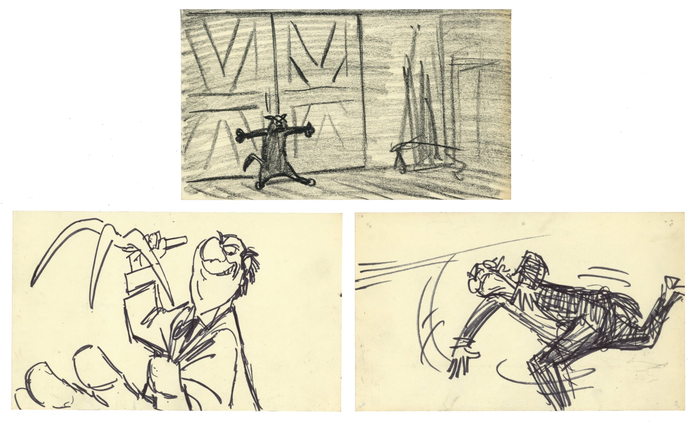 ABOUT THE IMAGE: These storyboards showcase the creativity involved in the making of The Aristocats. They were created for climactic sequence starting at about 1:12:52 when Edgar locks Duchess and her kittens in a trunk, ready to ship them off for good. O'Malley, Roquefort, Frau, and even Scat Cat and the Alley Cats help to stop him and make sure he's the one who is sent to Timbuktu. The artist of these storyboards is thought to be Vance Gerry (1929 - 2005), a storyboard, layout, and character artist at Disney for nearly 50 years.