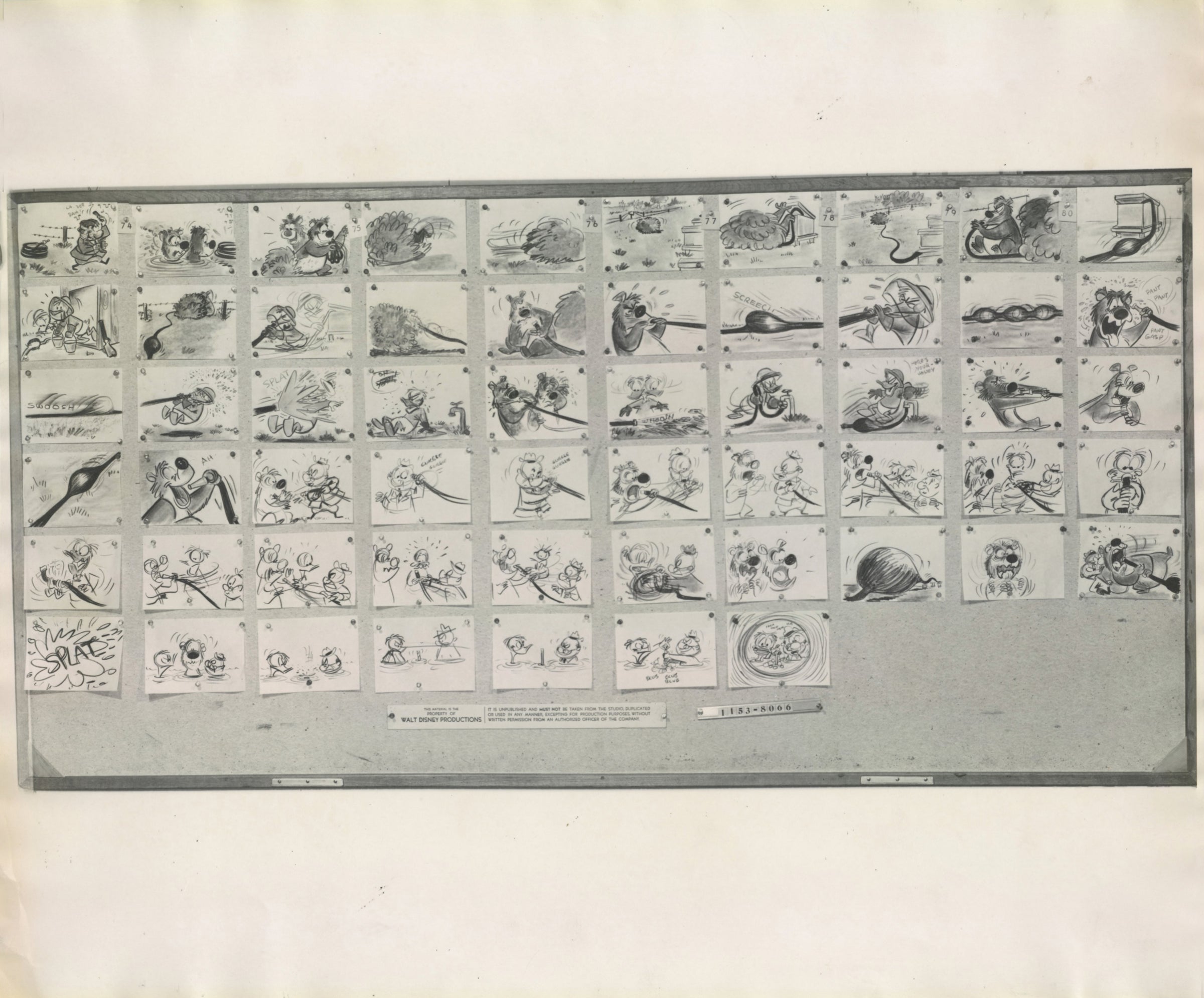 ABOUT THE MEDIUM: Storyboard Drawings show what’s moving in each shot, and in which direction, so that the production team is crystal clear on the desired end result. Photostat Storyboard Sheets are printed copies of the original storyboard drawings that were used by staff during the production of a film.