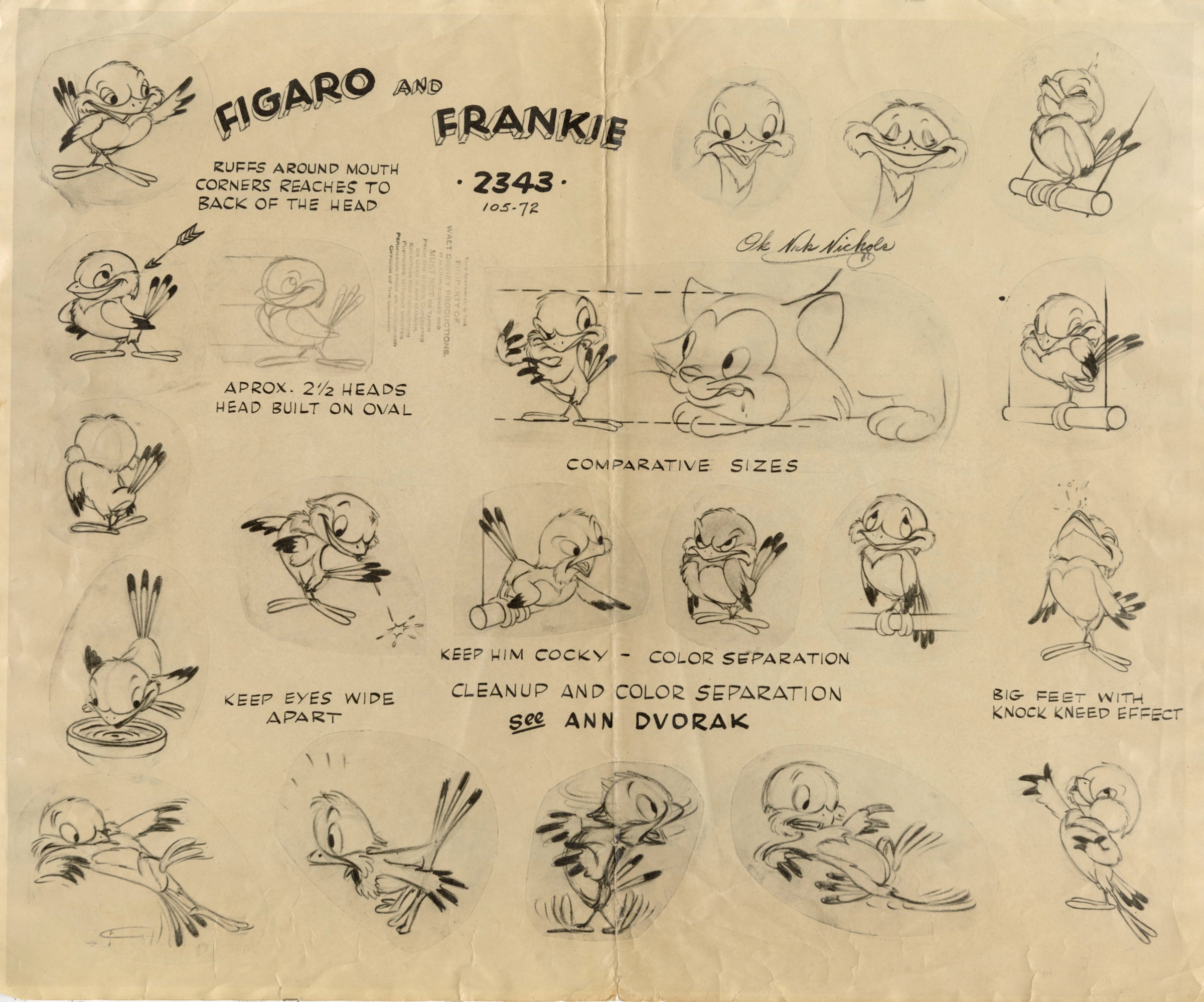 ABOUT THE MEDIUM: A model sheet is a group of character drawings illustrating different poses and expressions of a cartoon character. Because a number of artists worked on a single cartoon, these sheets were circulated to the animators to give a uniform look and feel to a character throughout a production.