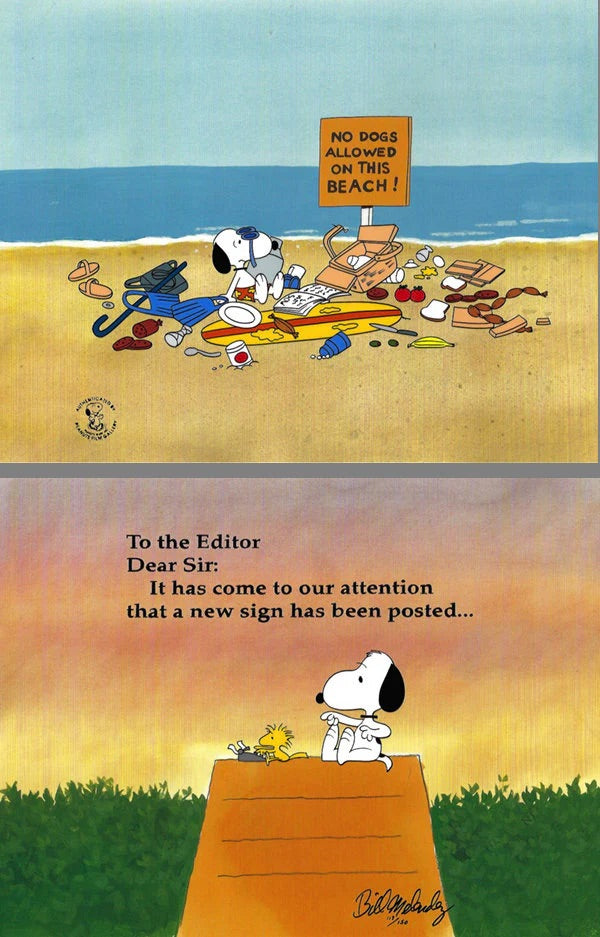 ABOUT THE IMAGE: Kicked off the Beach, ejected from the library, what's next...? The Literary Ace fires a letter off to the Editor! This diptych containing two 12 Field cels is based on the 1972 film "Snoopy, Come Home." It is signed by animator/director Bill Melendez, the voice of both Snoopy and Woodstock.