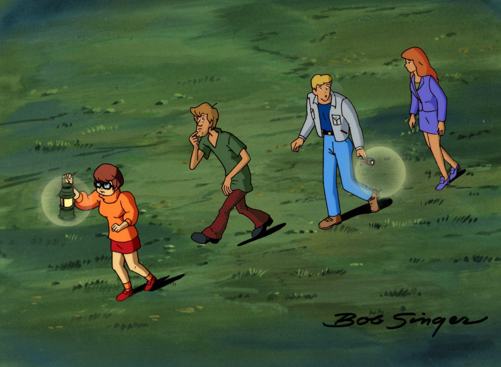 Scooby-Doo on Zombie Island Original Production Cel on Original Production Background Signed Bob Singer: Fred, Velma, Daphne
