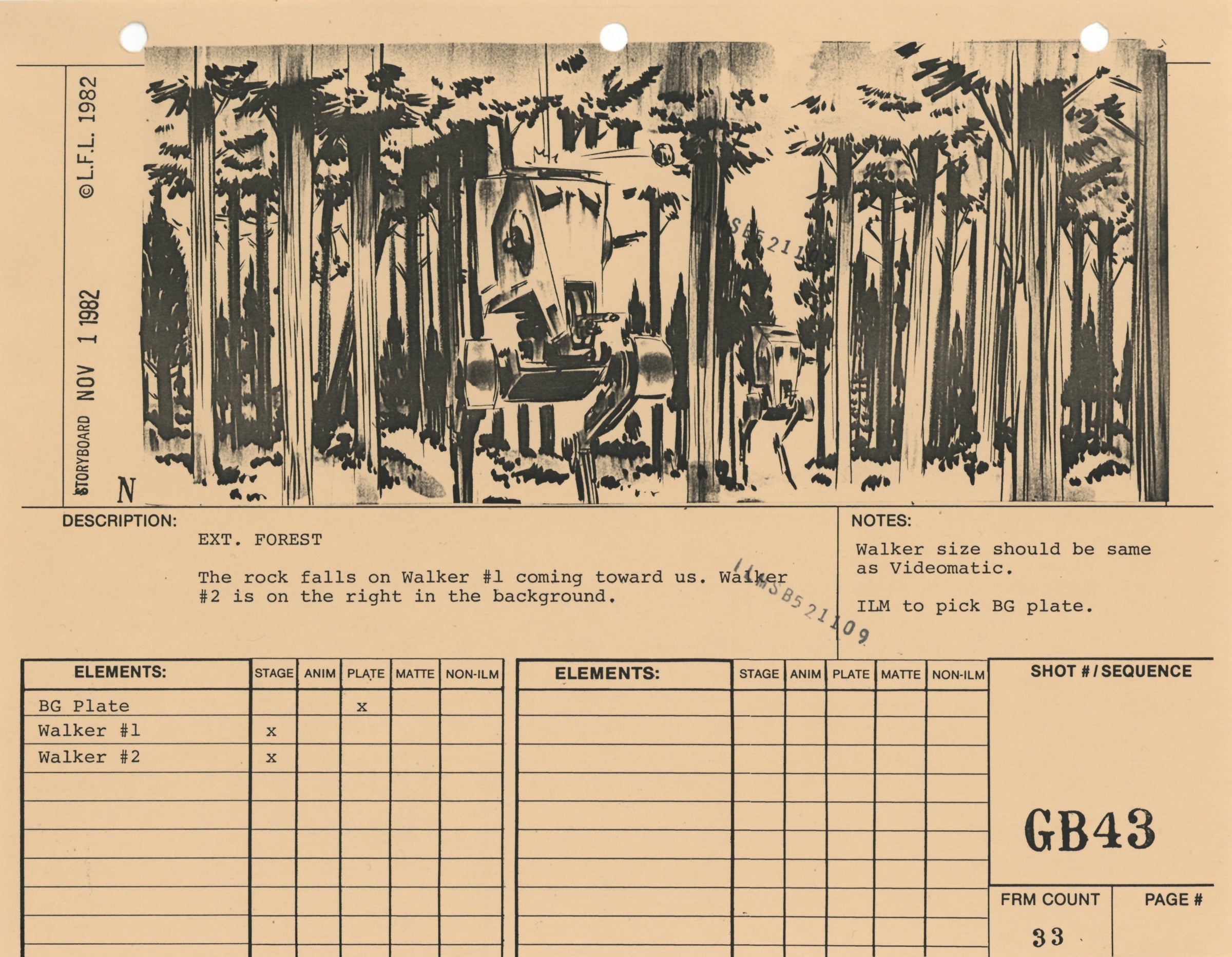 ABOUT THE ARTWORK: This photostat storyboard was used during the production of Star Wars: Episode VI - Return of the Jedi. Please note the two black "ILMSB521109" stamps as well as the 3-ring binder peg holes along the upper margin of this piece. The artist, Nilo Rodis-Jamero, is denoted by the "N" near the lower left corner of the image. Rodis-Jamero was the assistant art director of visual effects for Star Wars: Episode V - The Empire Strikes Back and costume designer for Star Wars: Episode VI - Return of the Jedi.