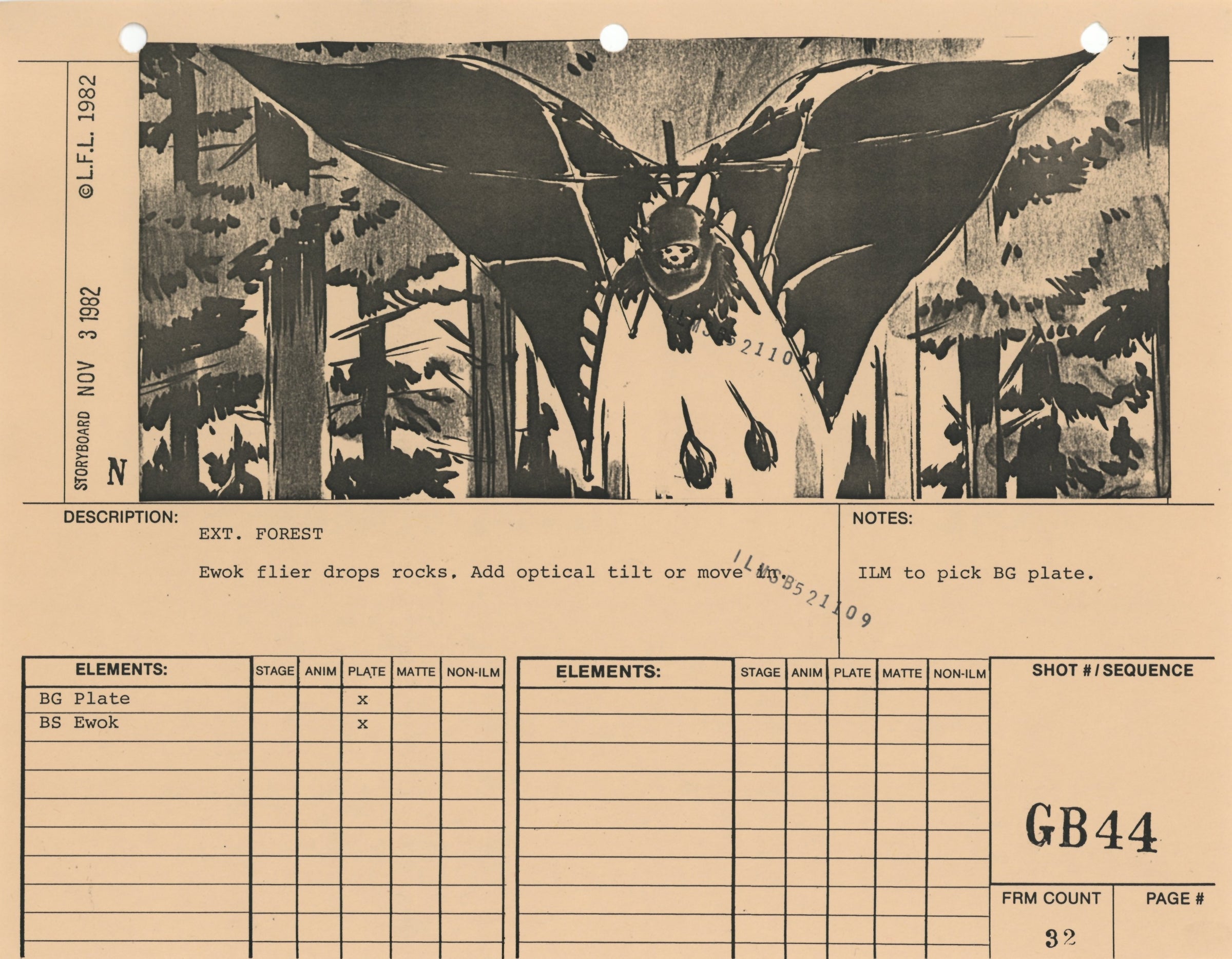 ABOUT THE ARTWORK: This photostat storyboard was used during the production of Star Wars: Episode VI - Return of the Jedi. Please note the two black "ILMSB521109" stamps as well as the 3-ring binder peg holes along the upper margin of this piece. The artist, Nilo Rodis-Jamero, is denoted by the "N" near the lower left corner of the image. Rodis-Jamero was the assistant art director of visual effects for Star Wars: Episode V - The Empire Strikes Back and costume designer for Star Wars: Episode VI - Return of the Jedi.