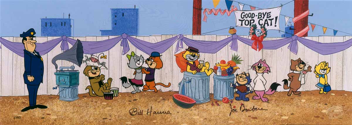 ABOUT THE IMAGE:  Besides being the indisputable leader of the gang, he’s thirty-five years old and still on his first life! Influenced by television’s “You’ll Never Get Rich” with Phil Silvers, Top Cat debuted September 27, 1961 as Hanna-Barbera’s second prime-time cartoon series (following The Flintstones). Voiced by character actor and comedian Arnold Stang, Top Cat actually a living in a New York City alley trash can seem enviable. "The Most Effectual Top Cat" is re-created from The Late T.C., the twenty-second of the series’ thirty episodes, and is hand-signed by the creators of the smart-aleck feline and his crew, William Hanna and Joseph Barbera.