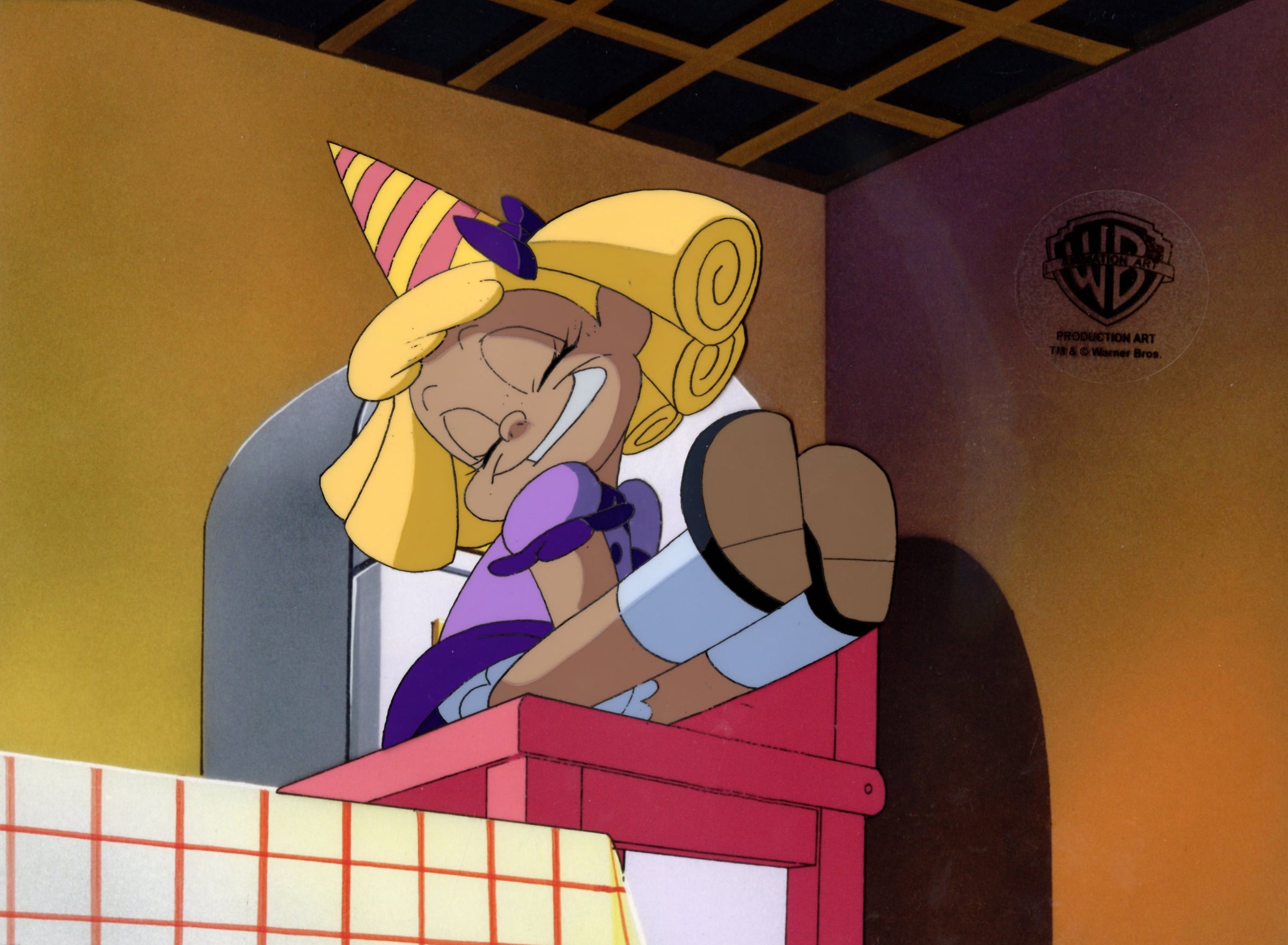 ABOUT THE MEDIUM: Original production cels are one-of-a-kind pieces of art that were used in the creation of an animated film or television show. Each has been hand-painted by studio artists on a piece of celluloid acetate, and has been photographed over a background painting to create a frame of the finished production.