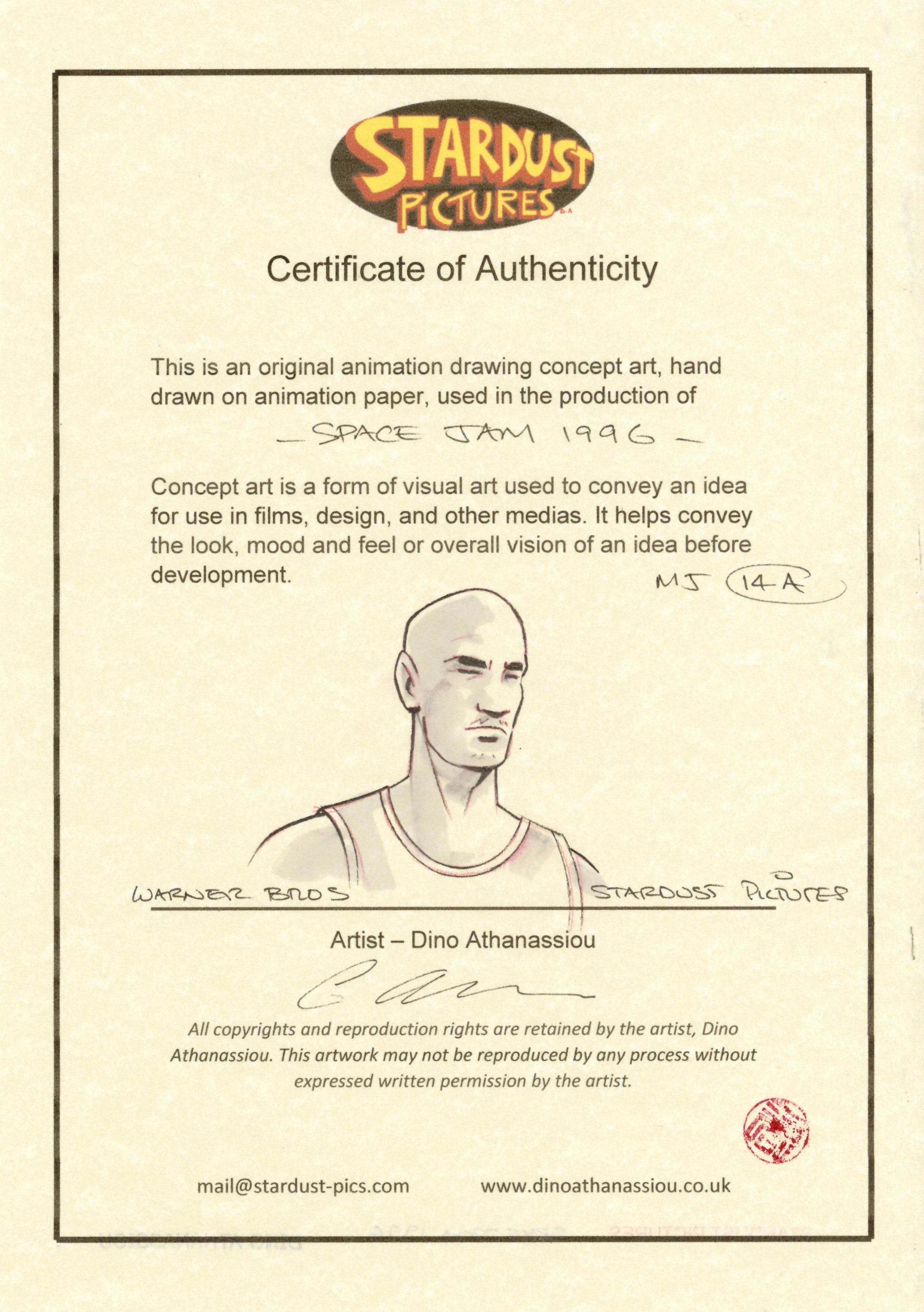 Signed by the artist, Dino Athanassiou, and accompanied by a Certificate of Authenticity from Stardust, this drawing represents a unique collectible. It captures the spirit of Space Jam, celebrating its blend of live-action and animation in a way that appeals to art collectors and film enthusiasts alike.