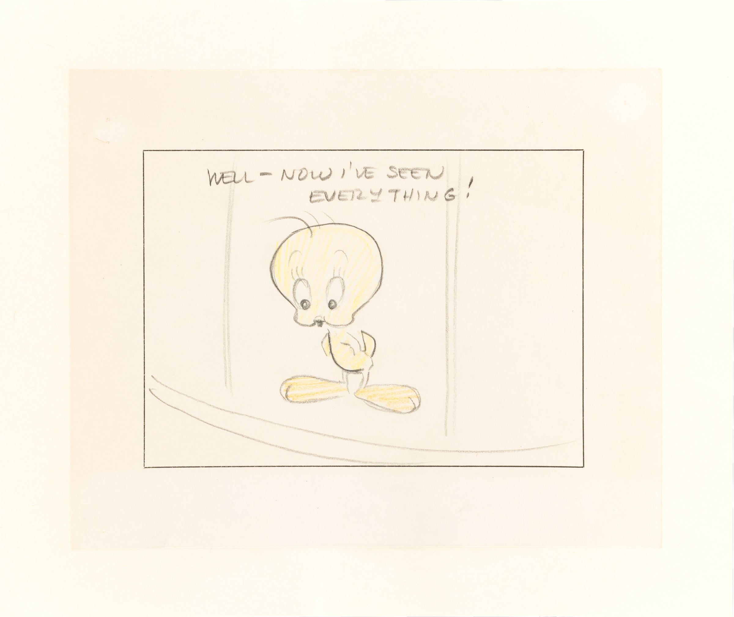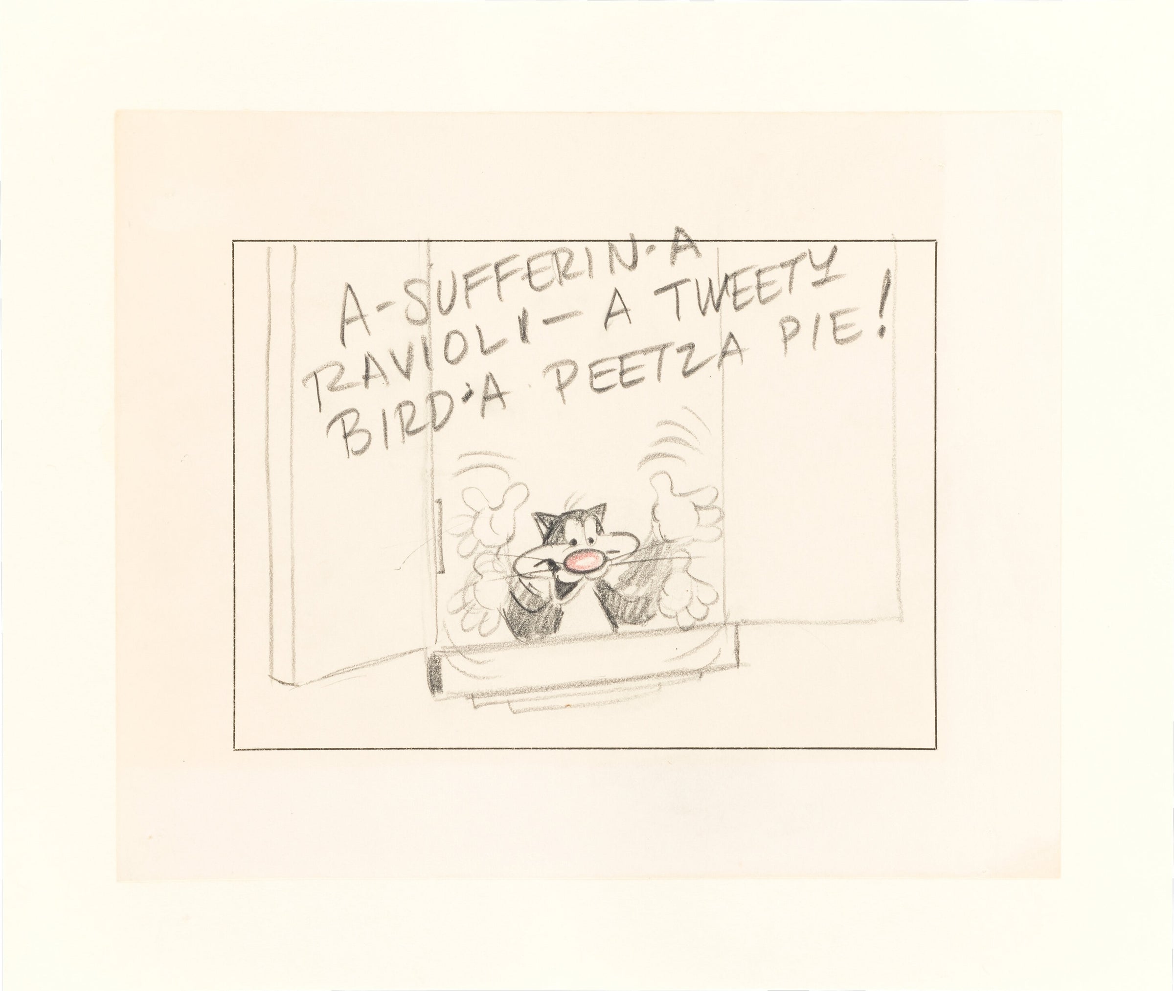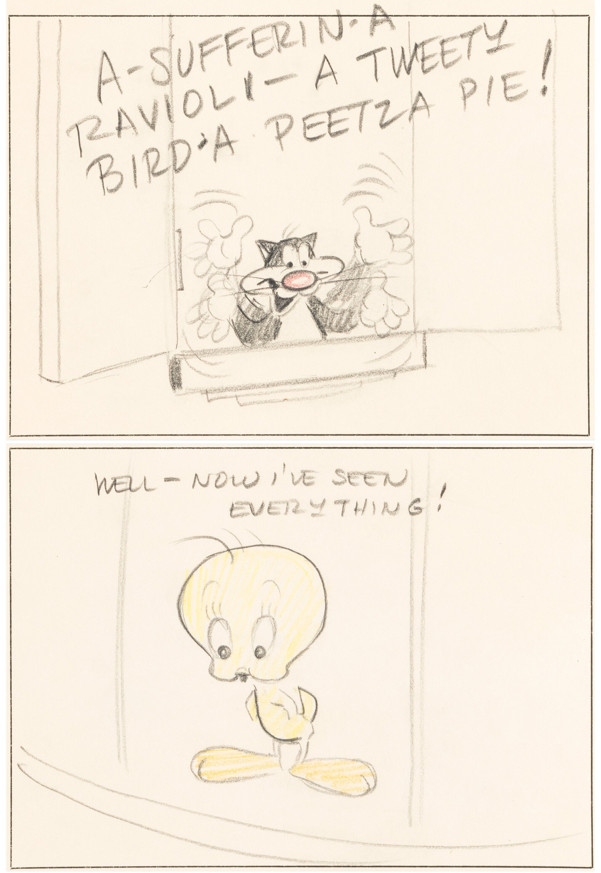 ABOUT THE IMAGE: Mama Mia! In this rare group of two original storyboard drawings, an Italian version of Sylvester spots a vacationing Tweety, resting in Granny's hotel room balcony. In the first storyboard drawing, Sylvester excitedly speaks in broken English ala Italiano when he sees Tweety; this closely matches the film at the 1:43 timestamp. The storyboard with Tweety depicts him quipping, "Well - now I've seen everything!" This gag was cut, as Tweety says only a few lines, and never utters this phrase. "A Pizza Tweety-Pie," was directed by Friz Freleng and written by Warren Foster.