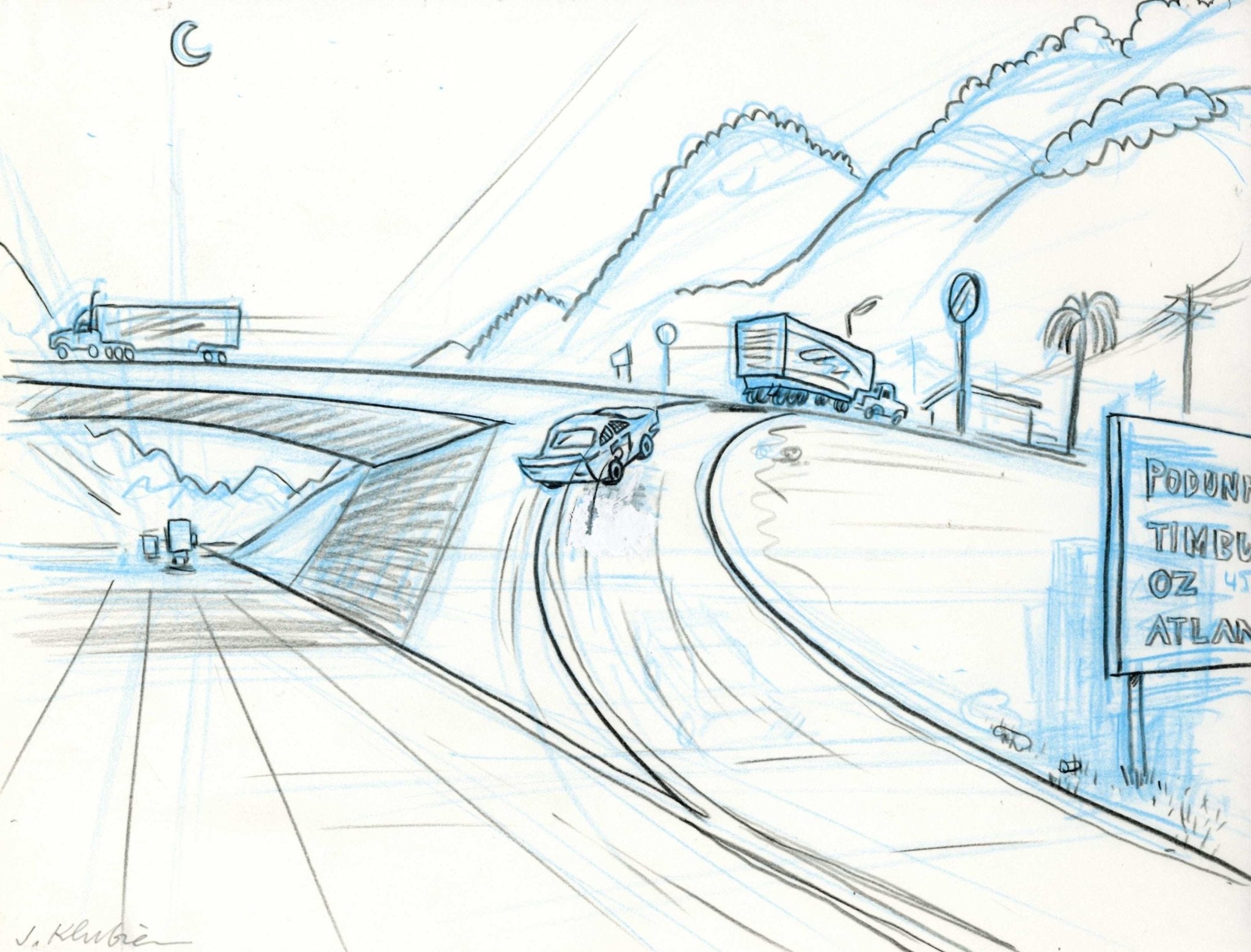 ABOUT THE IMAGE: A fantastic Beat Board from the Pixar production of Cars. Presented here is a wonderful original storyboard from Disney storyman Jorgen Klubien. Klubien is an animation artist and writer best known for his work on Disney films, like The Lion King (1994), A Bug's Life (1998), Cars (2006) and Frankenweenie (2012). The boards were rendered with black and blue colored pencil on 13" x 10.5" paper. This piece is signed by the artist, Jorgen Klubien in the bottom left.