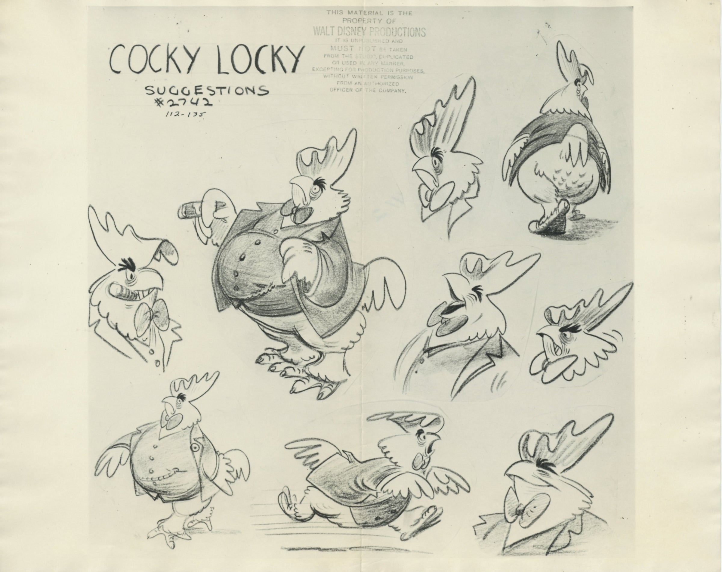 ABOUT THE MEDIUM: Photostat Model Sheets are reference guides used by animators to ensure consistency in character design, proportions, and expressions throughout a film. These printed sheets typically feature multiple poses, facial expressions, and turnarounds of a character, often photocopied from finalized drawings by lead animators. Model sheets help maintain uniformity in animation by providing a standard reference for all artists working on a character, preventing visual discrepancies between different scenes.
