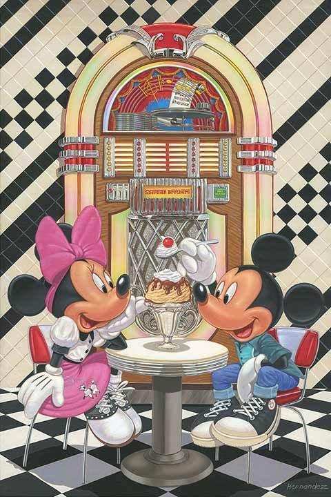 ABOUT THE IMAGE: Mickey and Minnie split a delicious ice cream sundae in their favorite diner while listening to music on from the jukebox.