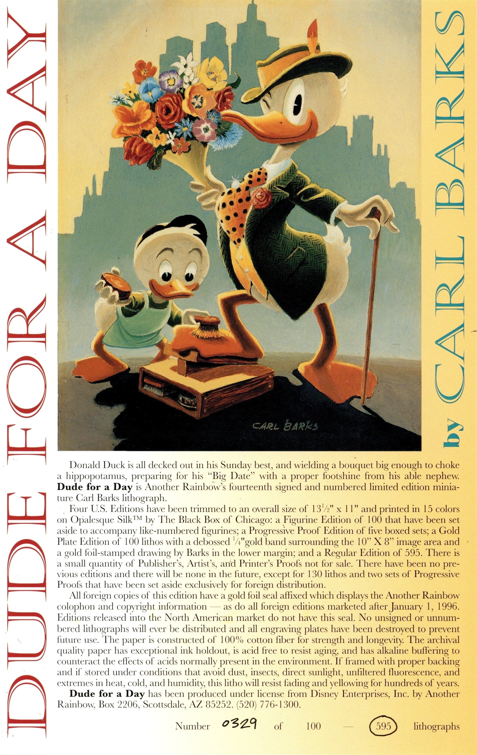 "Dude for a Day" was produced under license from Disney Enterprises, Inc. by Another Rainbow in 1997. The piece is signed by Carl Barks at the lower right and numbered 329 in a regular edition of 595. "©The Walt Disney Company" and Another Rainbow's "AR" symbol are embossed at lower left below the image.