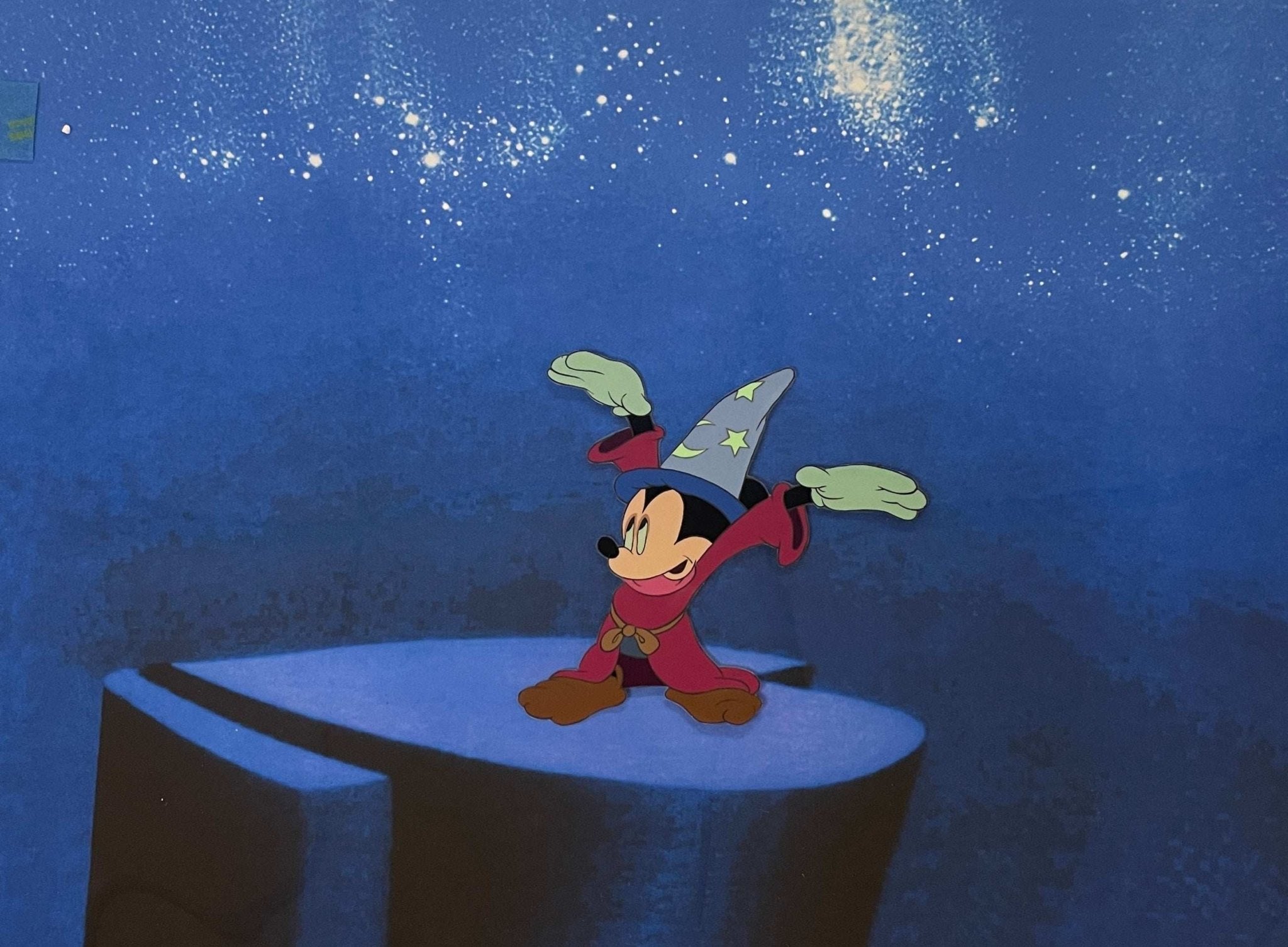ABOUT THE IMAGE: Beautiful hand-inked, hand-painted production cel of Mickey as the Sorcerer's Apprentice! The original cel has been trimmed to image and placed on a printed background.