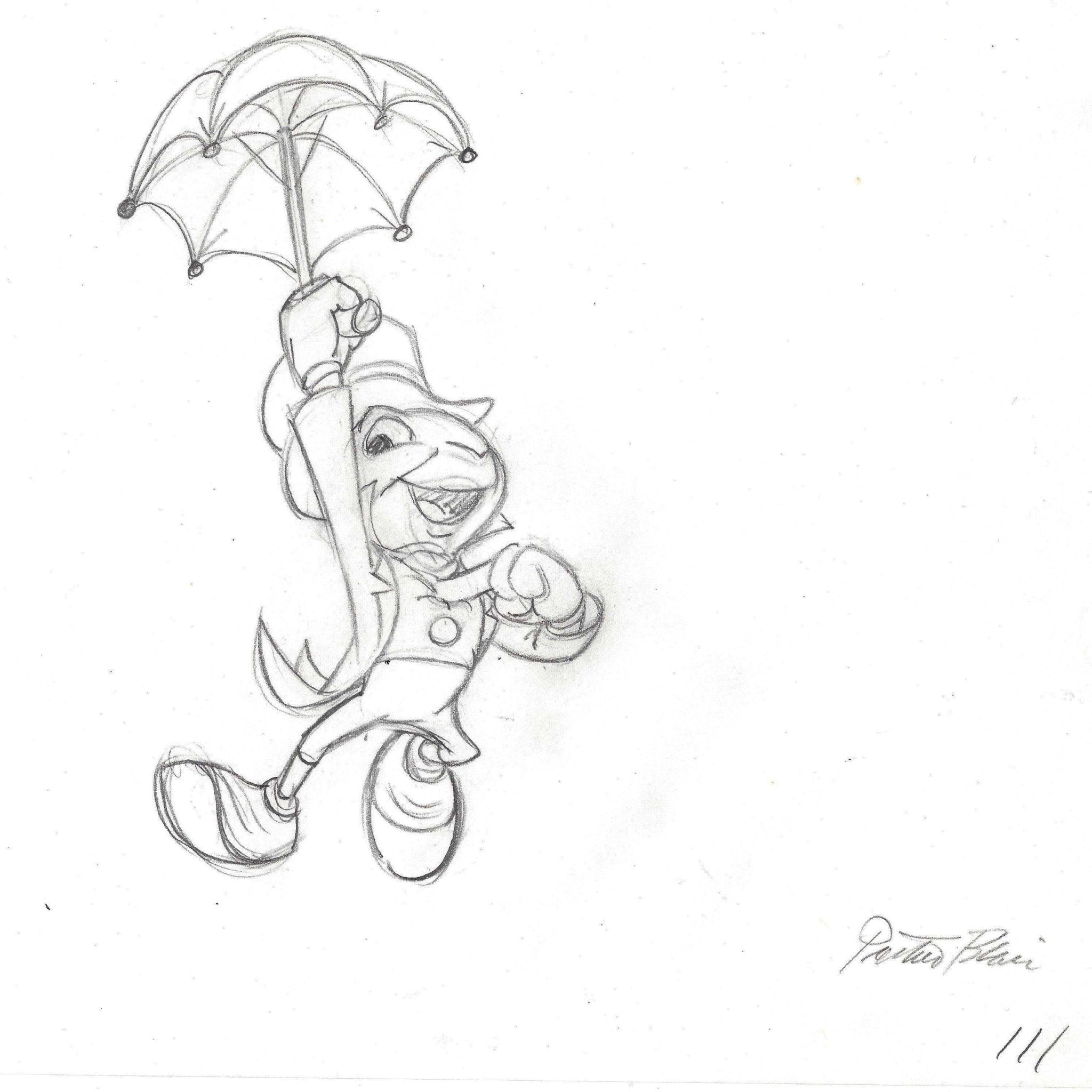 ABOUT THE IMAGE: In this scene, we see Jiminy as his jovial self drifting down with the help of an umbrella! This Original Production Drawing is hand-signed by Animator Preston Blair and comes with a Certificate of Authenticity!