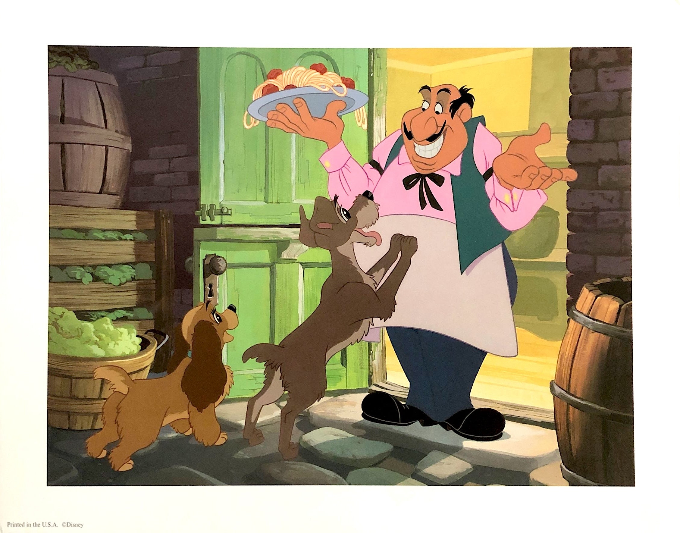 ABOUT THE PIECE: This is a wonderful portfolio of four 14" x 11" Lady and the Tramp lithographs that was exclusively sold at The Disney Store in the 1990s. The featured lithographs include "Unwanted Houseguests," "First Date," "Tony's World-Famous Spaghetti Dinner," and "Tramp Joins the Pack." Original certificate of authenticity included.