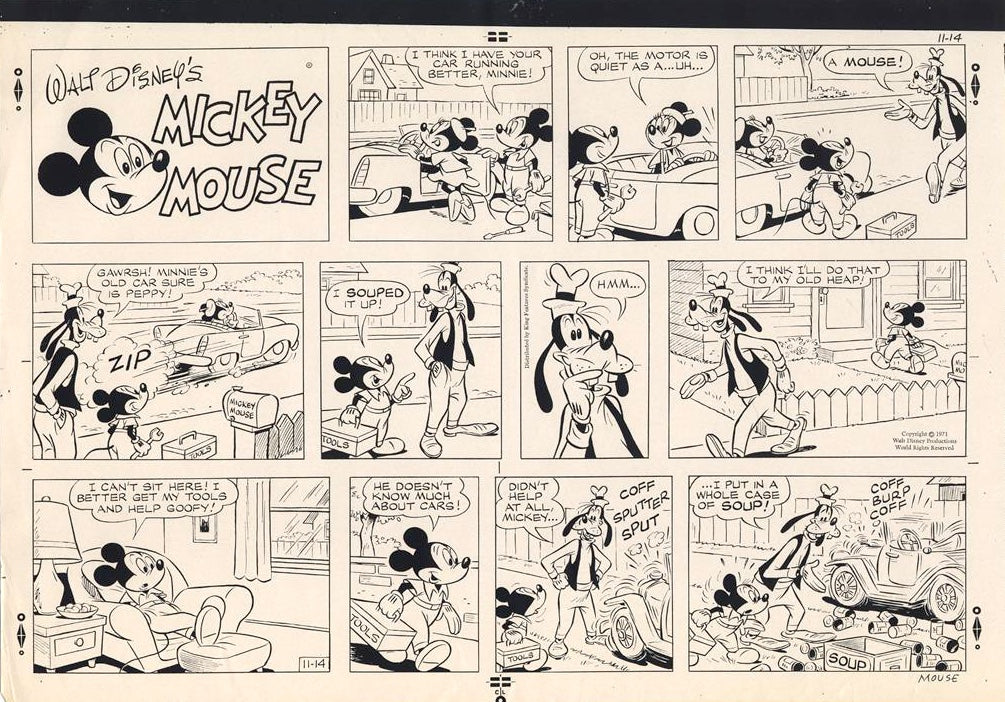 ABOUT THE IMAGE: This is artist-writer Del Connell's polished original drawing in pencil for the Mickey Mouse Sunday comics page published on November 14, 1971 along with the matching black-and-white proof sheet that was issued to newspapers carrying the feature. Mickey, Goofy and Minnie are featured in this story inspired by American car culture.