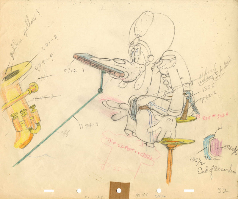 ABOUT THE IMAGE: "We now have Bandmaster Goofy!" announces Mickey Mouse to his live radio audience. "And his fifty-piece band!" chimes in Goofy. This 1937 short is a parody of "amateur hour" radio shows of the time, and it stars a cast of beloved Disney characters as they attempt to impress Mickey with their various performances. Goofy takes the stage with a clumsy contraption which he constructed to allow him to play fifty different instruments on stage as a one-man-band!