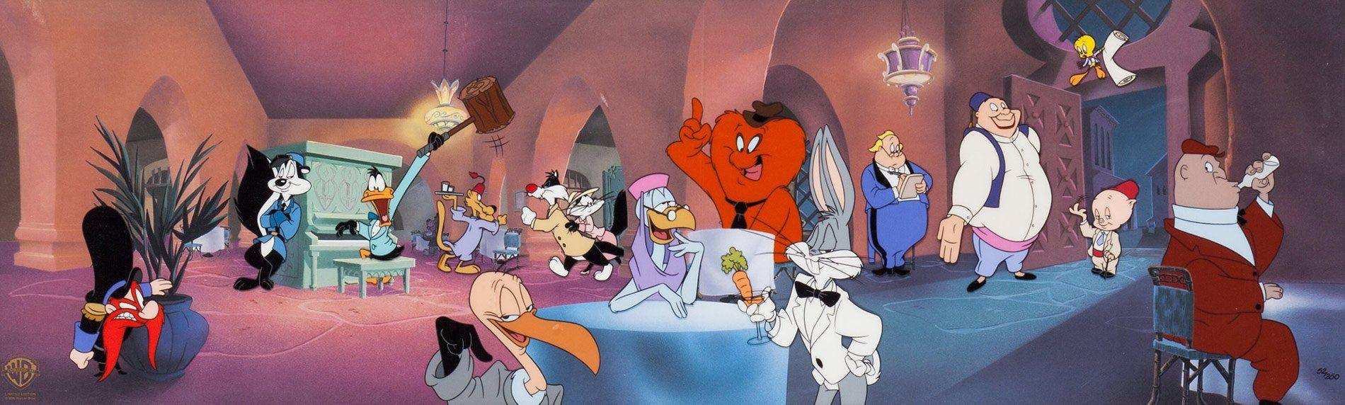 ABOUT THE IMAGE: Rare hand-painted limited edition pan cel, created to promote the Warner Bros. animated short, Carrotblanca, a spoof on the classic film Casablanca. Over 15 Looney Tunes characters are displayed, including Sylvester, Yosemite Sam, Daffy Duck, Tweety, Pepé Le Pew, Porky Pig, and of course Bugs, in his best Humphrey Bogart attire. A nice Title Card cel with the Carrotblanca logo is matted along with the cel and printed background.