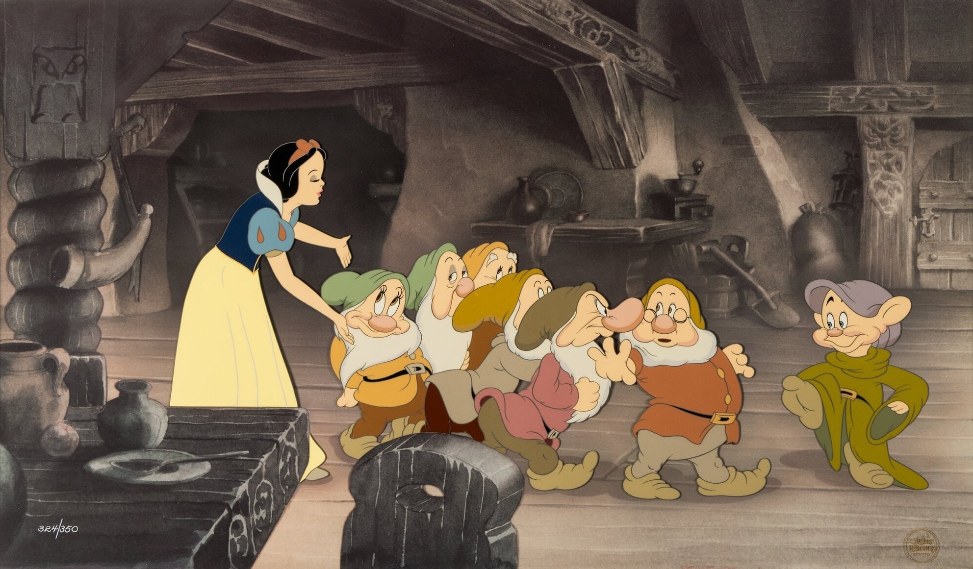 ABOUT THE IMAGE: "Oh my goodness! It's past bedtime. Go right upstairs to bed." With motherly authority, Snow ushers all the Dwarfs off to sleep after her post-revelry story-time in this incredible hand-painted, hand-inked limited edition cel numbered #324/350 for the Disney classic Snow White and the Seven Dwarfs. This remarkable limited edition was created by the talented artists at the Disney Studios Ink and Paint Department, based on archived animation drawings created during the original production of the film in the 1930s. This charming scene is similar to the moments spotted beginning near the 59:00 timestamp at the cottage cuckoo clock strikes 11pm alerting Snow to the lateness of the hour.