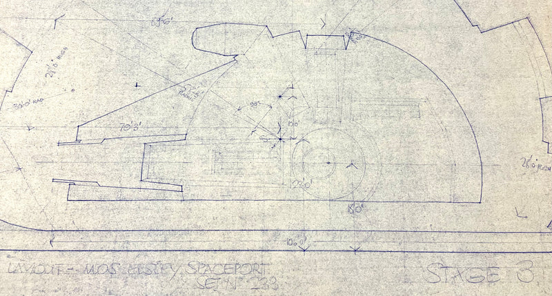 ABOUT THE IMAGE: This incredible photostat print of the Mos Eisley Spaceport on Tatooine was made from the original Industrial Light & Magic blueprint. George Lucas gave Norman Jacobs unprecedented access and permission to reproduce production blueprints for publication in his Starlog "Star Wars Technical Journals" licensed by the Lucas Org. The piece is printed from original ILM vellum on 51" x 36"blue line paper depicting an elevation of the Mos Eisley Space Port marked "Stage Layout – Mos Eisley Spaceport Set No. 233, Stage 3." It is dated, "20 Jan. 76" in the text block, which bears the working title, "The Star Wars." An outline of the Millennium Falcon also visible in the bottom half of the piece. (Exhibiting age and handling with some toning, curling, and tears to edges, not affecting imagery.)