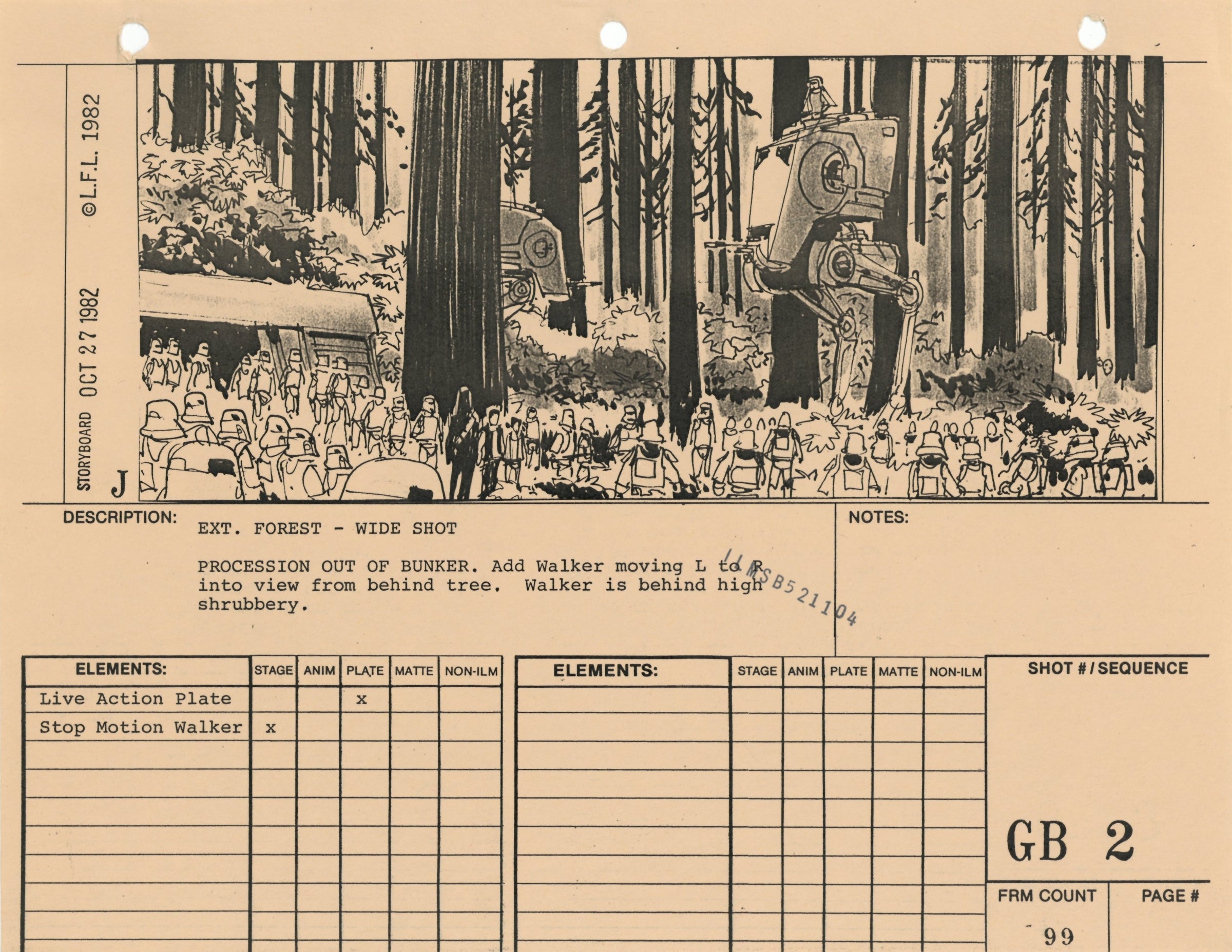 ABOUT THE ARTWORK: This photostat storyboard was used during the production of Star Wars: Episode VI - Return of the Jedi. Please note the two black "ILMSB521104" stamps as well as the 3-ring binder peg holes along the upper margin of this piece. The artist, Joe Johnston, is denoted by the "J" near the lower left corner of the image. Johnston worked on all three films of the original Star Wars trilogy and was most notably the art director for both The Empire Strikes Back (1980) and Return of the Jedi (1983).