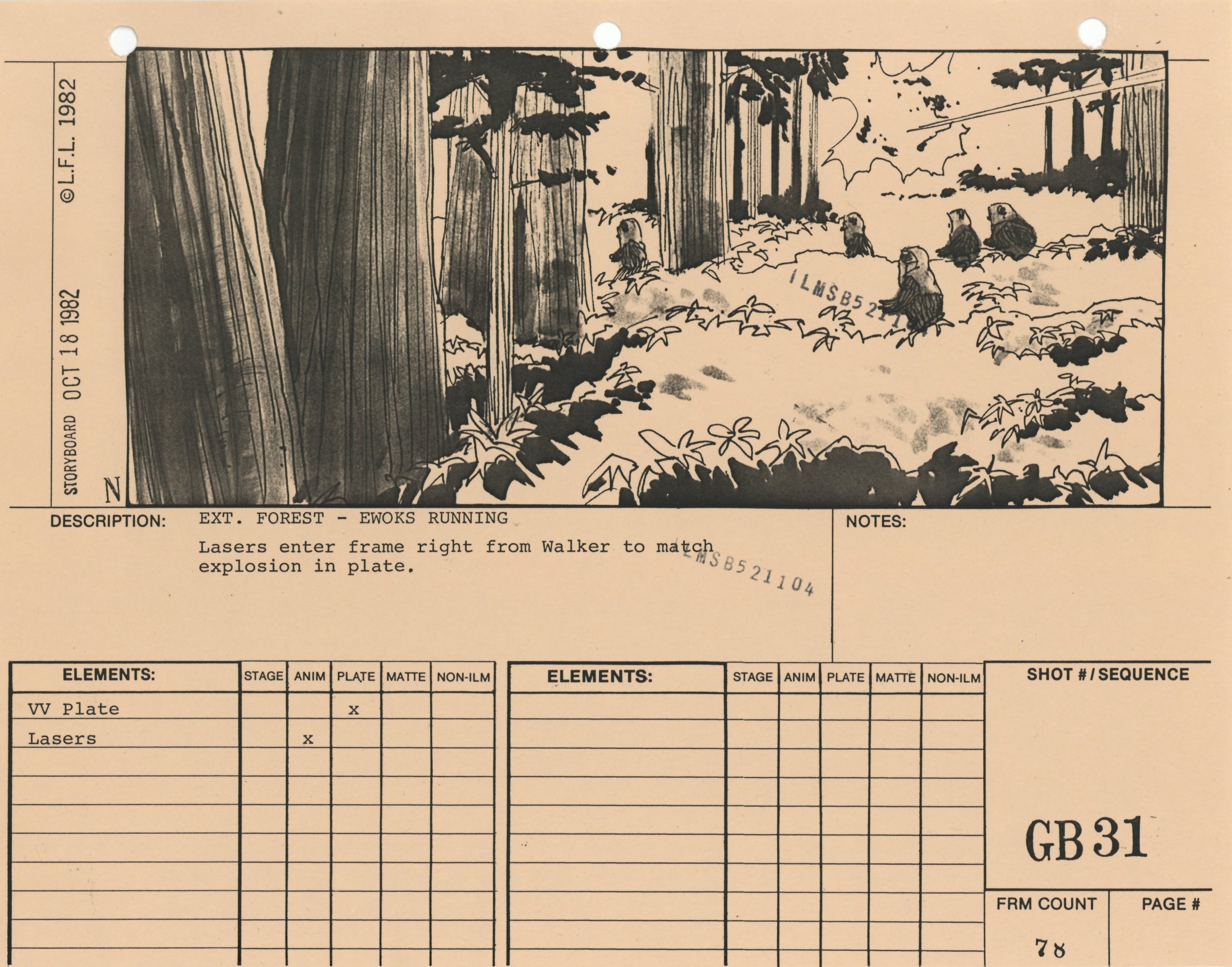 ABOUT THE ARTWORK: This photostat storyboard was used during the production of Star Wars: Episode VI - Return of the Jedi. Please note the two black "ILMSB521104" stamps as well as the 3-ring binder peg holes along the upper margin of this piece. The artist, Nilo Rodis-Jamero, is denoted by the "N" near the lower left corner of the image. Rodis-Jamero was the assistant art director of visual effects for Star Wars: Episode V - The Empire Strikes Back and costume designer for Star Wars: Episode VI - Return of the Jedi.
