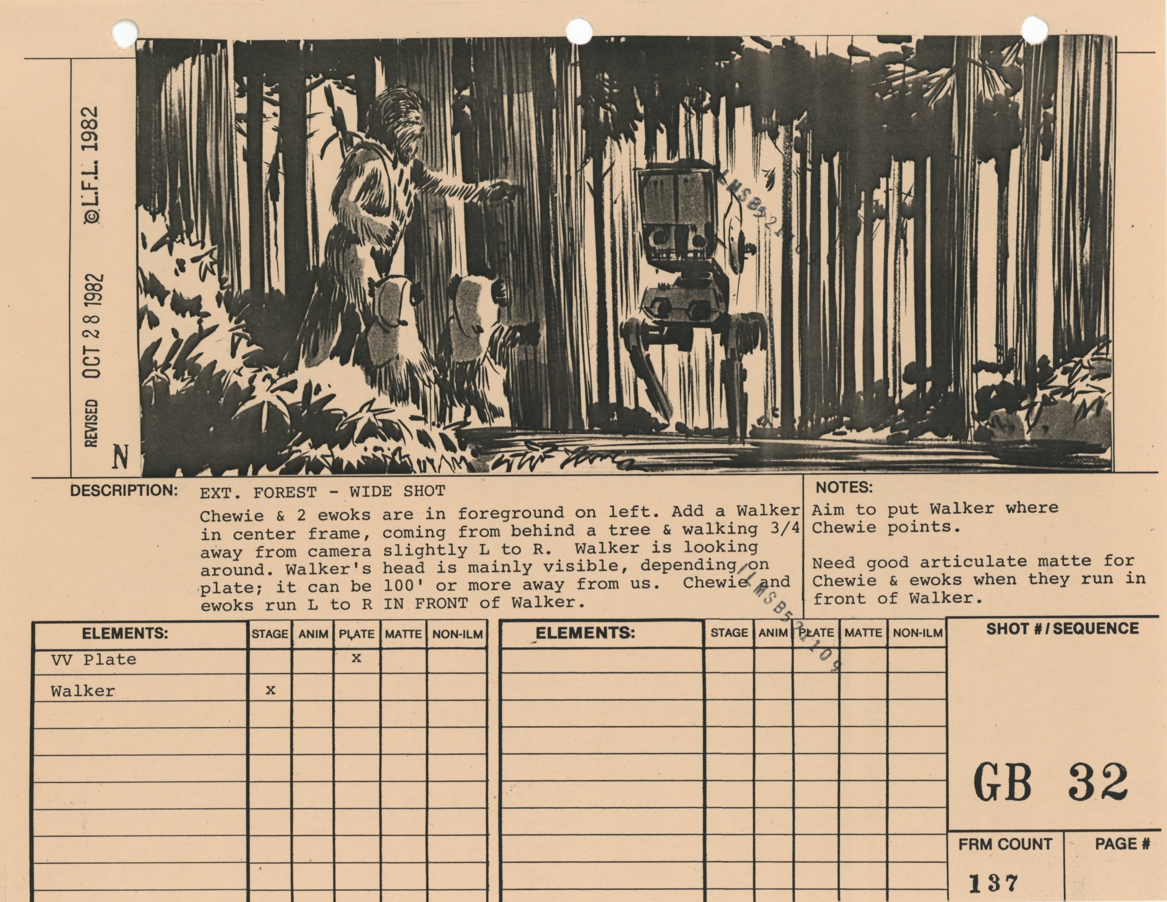 ABOUT THE ARTWORK: This photostat storyboard was used during the production of Star Wars: Episode VI - Return of the Jedi. Please note the two black "ILMSB521109" stamps as well as the 3-ring binder peg holes along the upper margin of this piece. The artist, Nilo Rodis-Jamero, is denoted by the "N" near the lower left corner of the image. Rodis-Jamero was the assistant art director of visual effects for Star Wars: Episode V - The Empire Strikes Back and costume designer for Star Wars: Episode VI - Return of the Jedi.