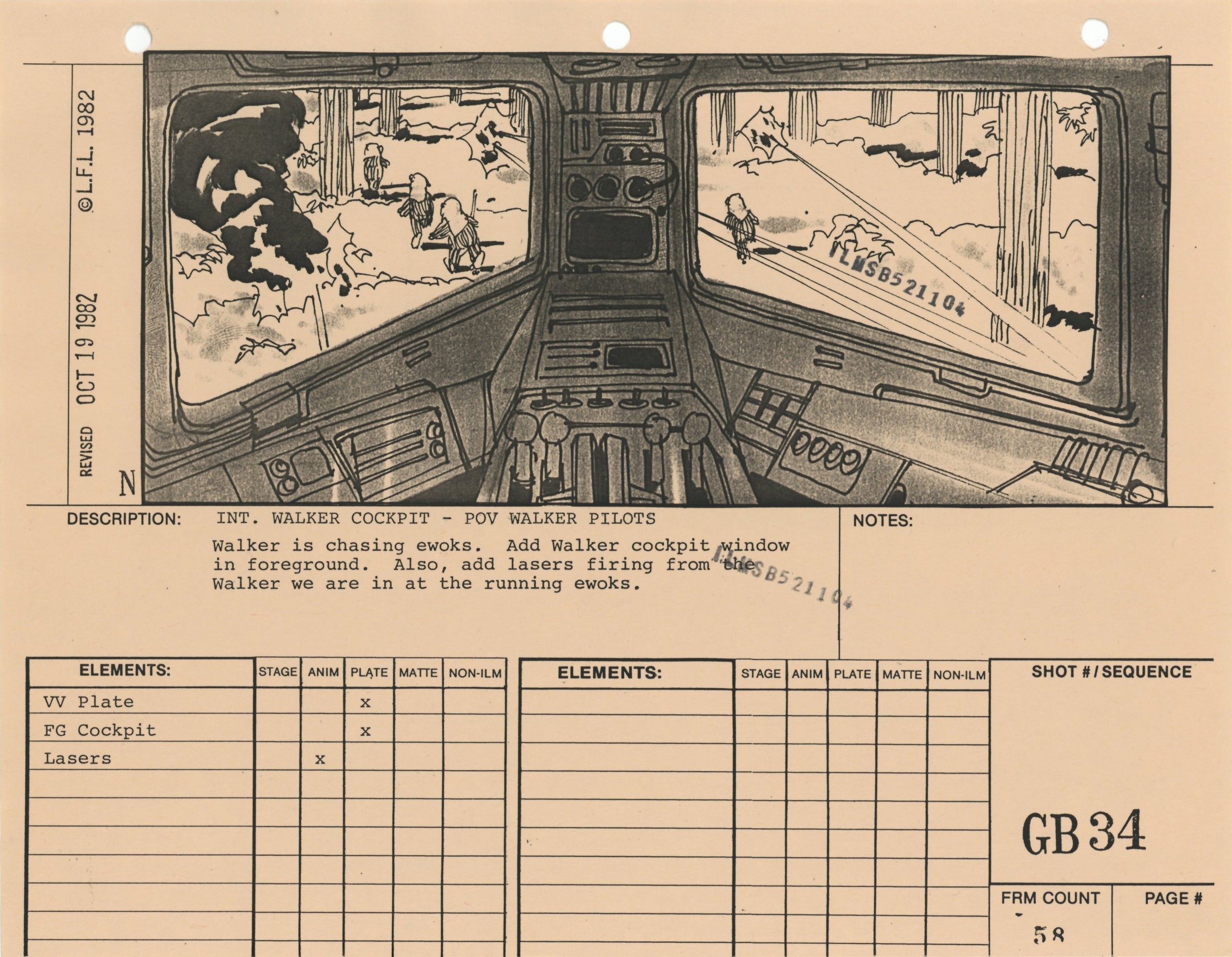 ABOUT THE ARTWORK: This photostat storyboard was used during the production of Star Wars: Episode VI - Return of the Jedi. Please note the two black "ILMSB521104" stamps as well as the 3-ring binder peg holes along the upper margin of this piece. The artist, Nilo Rodis-Jamero, is denoted by the "N" near the lower left corner of the image. Rodis-Jamero was the assistant art director of visual effects for Star Wars: Episode V - The Empire Strikes Back and costume designer for Star Wars: Episode VI - Return of the Jedi.